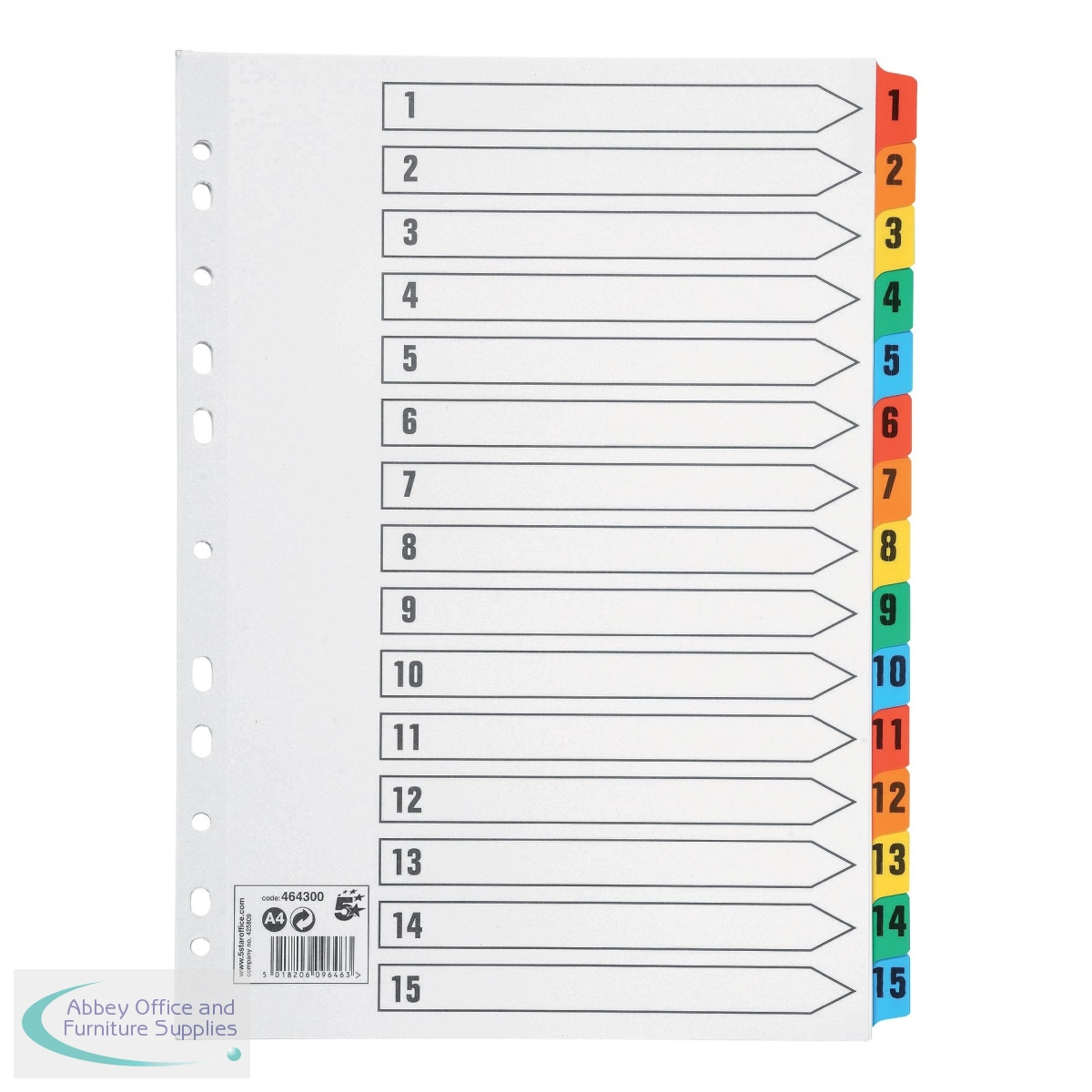 5 Star Office is a competitive range of office stationery. These 1-15 file dividers are a high quality option made with 15 Mylar reinforced numeric tabs (1-15) for extra durability. The brightly coloured tabs help separate sheets and documents. File dividers are a convenient way of keeping track of your documents when you have them stored in folders. The 5 Star Office A4 file dividers are extra strong due to the Mylar reinforcement and have labelled tabs from 1-15 for organisation. Suitable for all A4 lever arch files and ring binder folders and available as a set of 15 dividers.