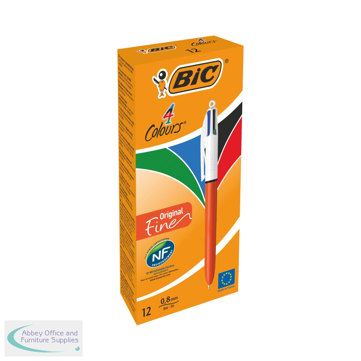 BIC 4 Colours Original Fine pens are the fine point version of the famous BIC 4 Colours ballpoint pen. Choose from blue, black, green or red without changing pens. Perfect for taking and organising notes, correcting and drawing. The easy-flow ink paired with meticulously crafted ballpoints for seamlessly smooth writing that is fine and precise. Made in France, these ballpoint pens are supplier in a pack of 12.
