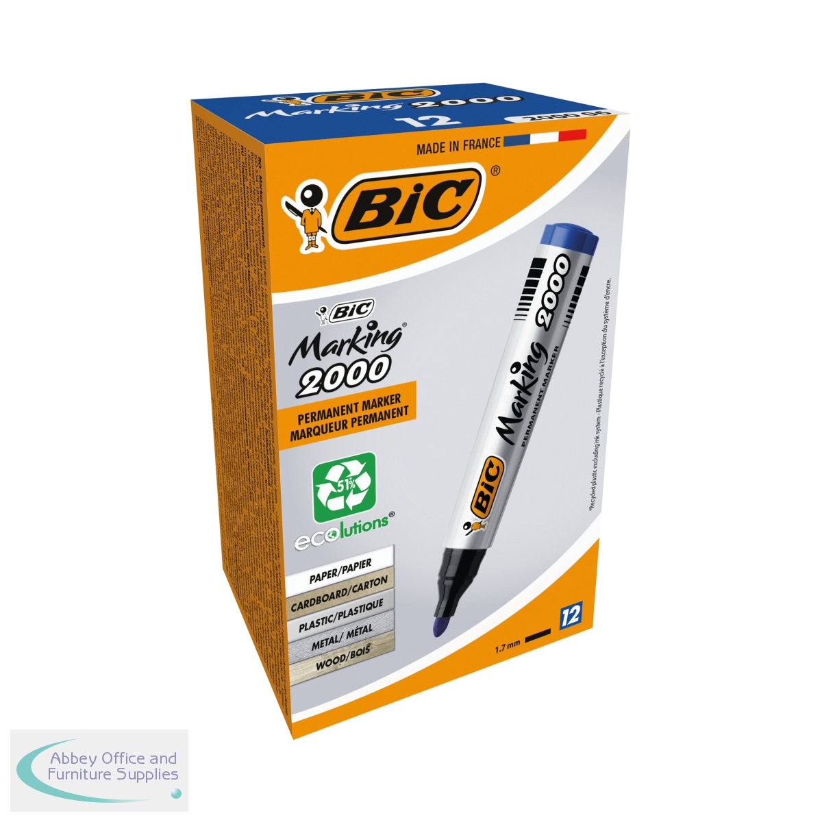 BIC Marking 2000 ECOlutions permanent markers with rugged bullet nibs for creating clean and thick 1.7mm lines. These indelible pens work on almost all surfaces from paper, cardboard and plastic to glass, metal and CDs. Made in Europe with 51% recycled materials (not including the ink system), supplied in a pack of 12 blue, bullet tip markers.