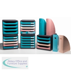 Skandi brings soft, natural shades to organisation with this stylish range of desktop accessories, ideal for any modern workspace or home office. Made from recycled materials, created from post-consumer recycled plastic waste. The Skandi Big-Box has been designed as a single piece unit, therefore is more resistant and durable. Featuring four open drawers for storage of A4 and A4+ documents in an assortment of colours: Frosted blue, nude, old rose and pacific blue.