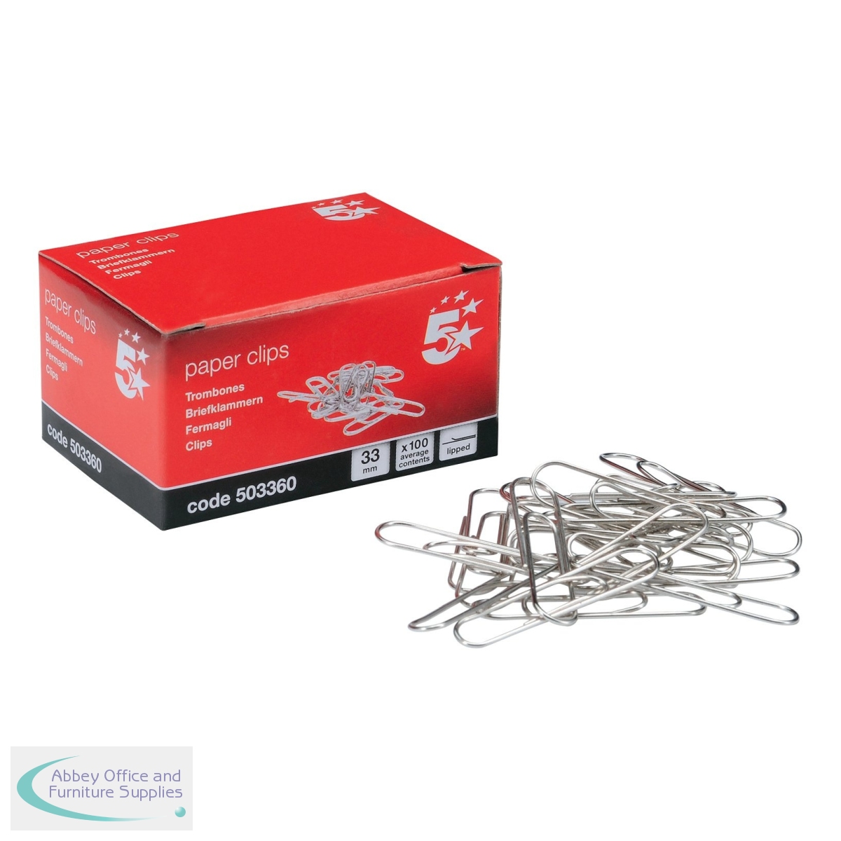 5 Star Office high quality wire paper clips. Perfect for organising paperwork and keeping your desk and workspace organised. Supplied as 10 boxes of 33mm paper clips containing 100 traditional steel paper clips in each box.