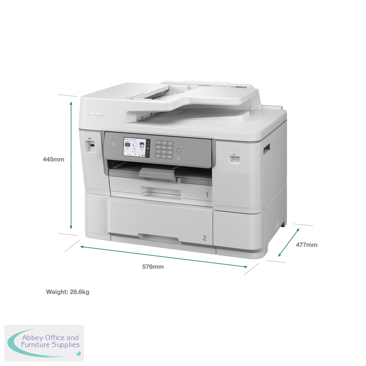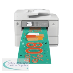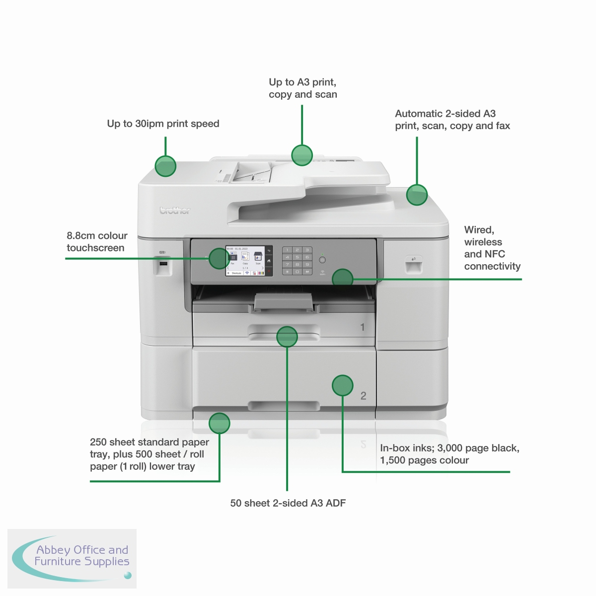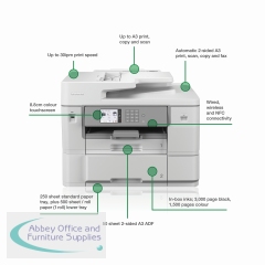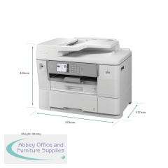 This Brother all-in-one colour inkjet printer with A3/large format capability. For A3 and A4 printing and scanning, capable of printing on a roll of paper. To easily print banners, posters, panoramic photos and promotional signage, all cut to size with the automatic cutter. Provides wired and wireless connectivity. Near-field communication (NCF) for secure authentication, mobile print and scan. Prints up to 30ipm. Automatic 2-sided A3 print, scan copy and fax. Features standard tray with 250 sheet capacity, a lower tray with 500 sheet capacity and takes 1 paper roll. ADF has a capacity of 297mm width, and length 148mm to 431.8mm.