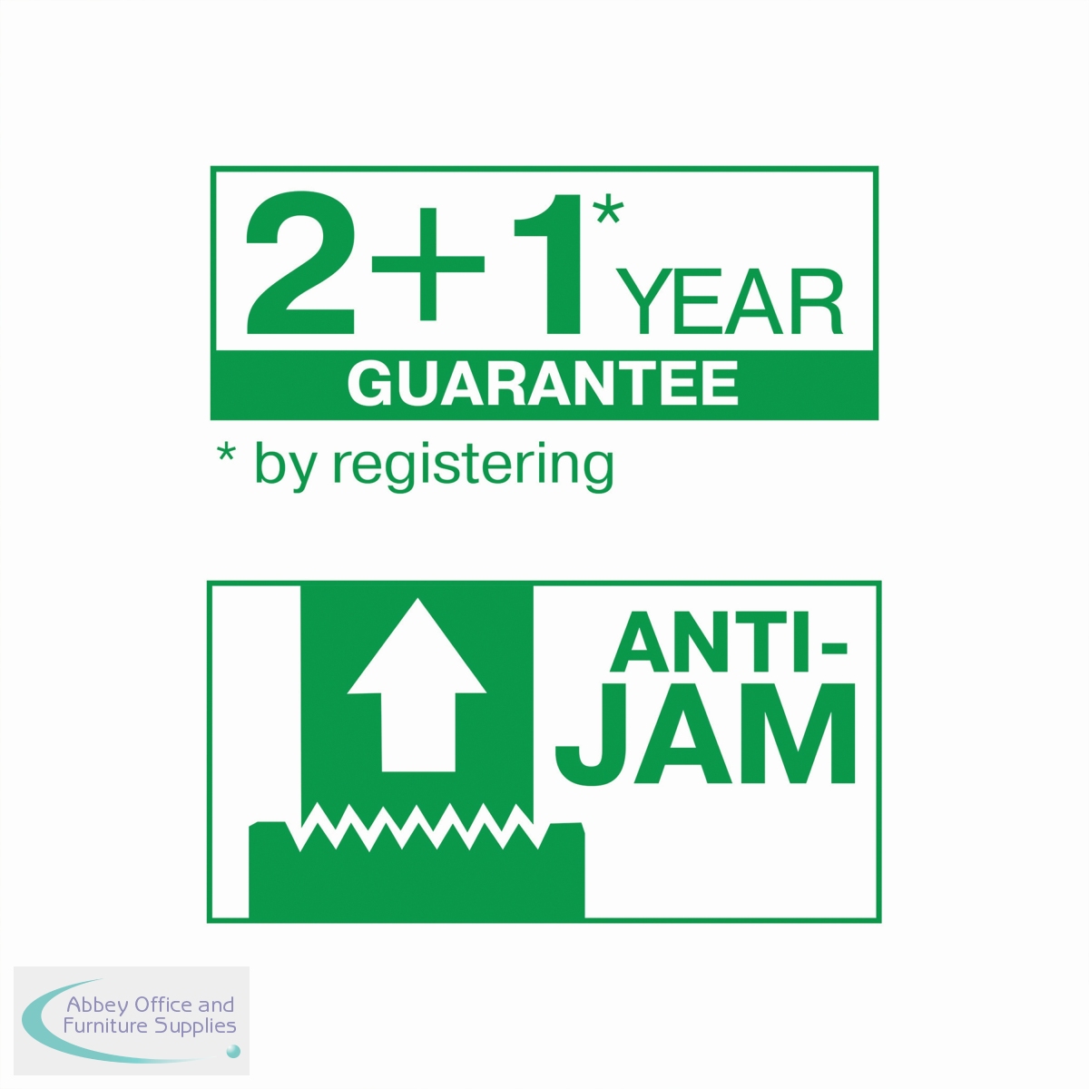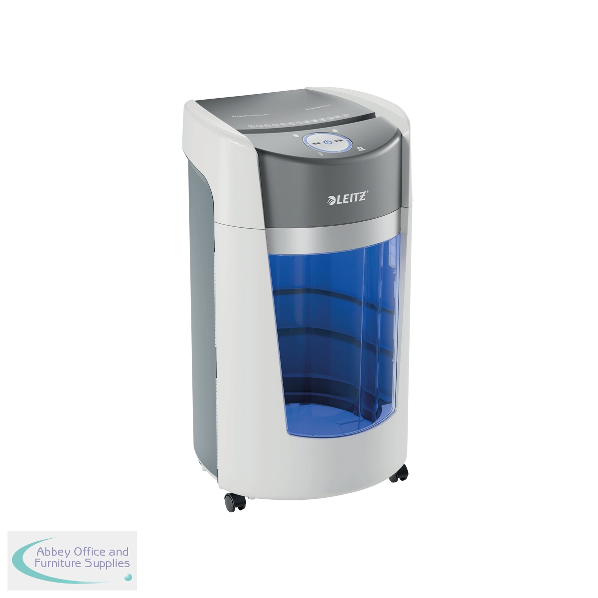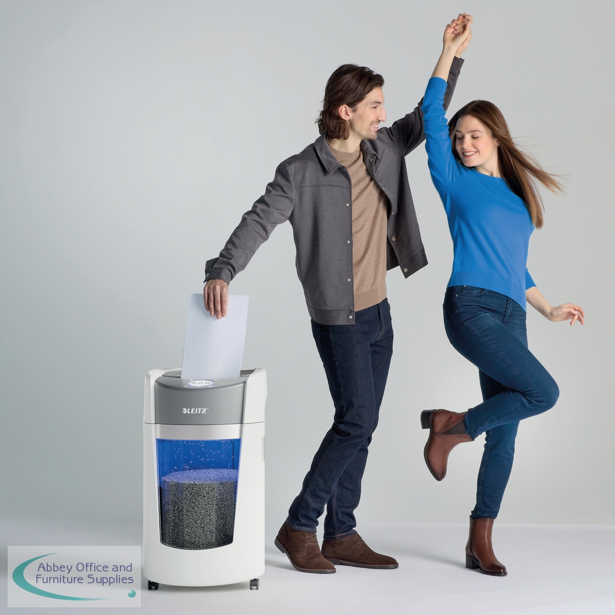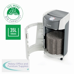 The Leitz Optimax Micro-Cut shredder gives a new spin on shredding. Featuring a rotating illuminated bin which prevents peak build up, giving 33% more sheet capacity with less manual intervention and mess. The clever interface has a unique touch control dial with illumination, showing when in operation and clearly highlights any problems when shredding. Designed to fit into any office space with a rounded back for corner positioning and removable bin for easy emptying. The superior motor gives an incredible 2-hour continuous shredding and low noise to minimise disruption in the office environment. Automatically shredding 10 sheets of A4 into security P-5 (2x15mm) micro-cut pieces in one go, the Leitz Optimax is supplied in white.