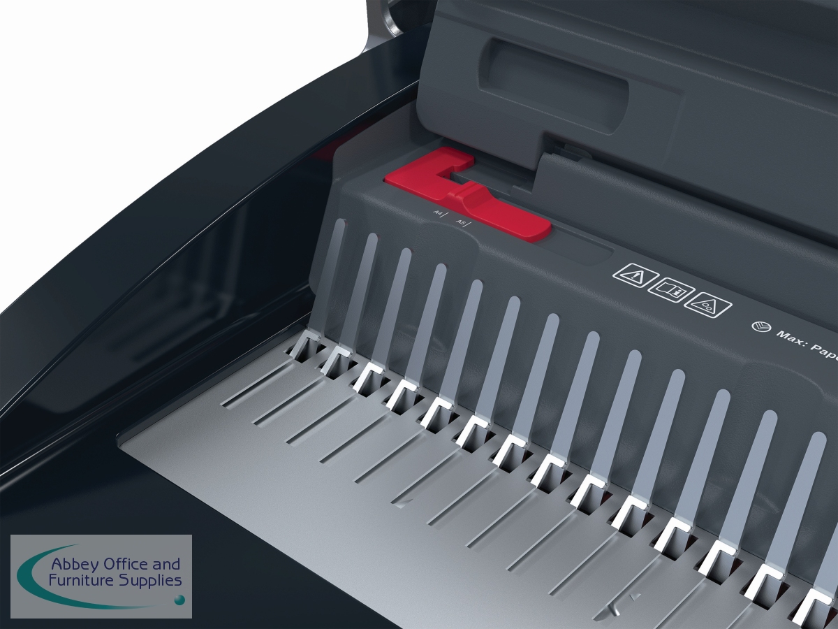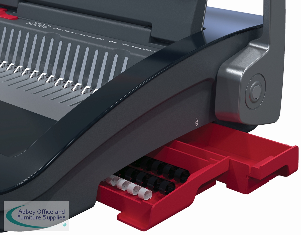 The CombBind CB25 is a reliable and compact manual comb binder designed for shared use in office and school environments with medium volume demands. It can punch through up to 25 sheets of 80gsm paper and efficiently bind up to 450 sheets at a time using 45mm spines. Its lightweight, space-saving design makes it ideal for use anywhere, anytime, and easy to store when not in use. For added convenience, it features a clippings tray for easy disposal and a storage compartment. Supplied in black and silver.