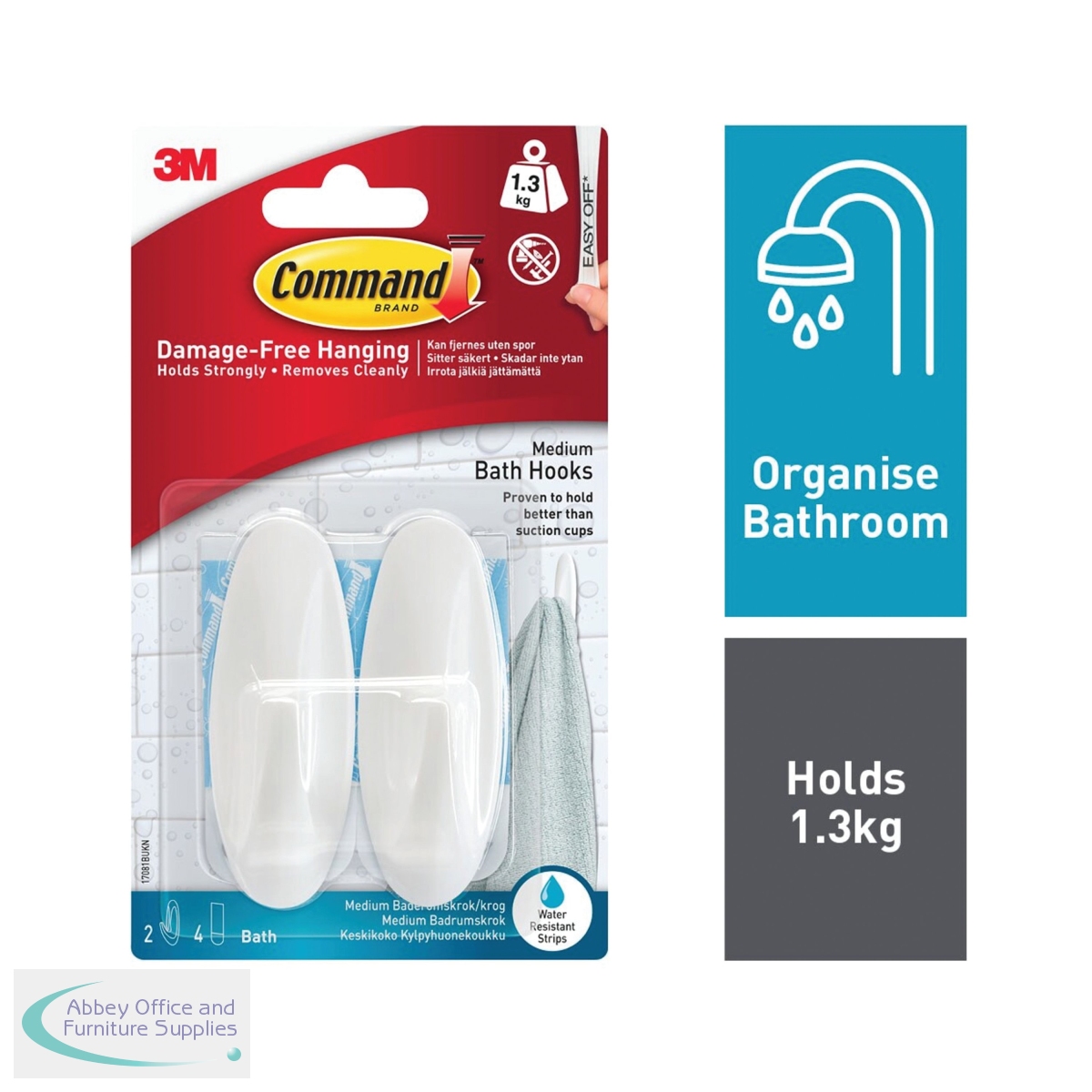 Command Bath Medium Designer Hooks come with water-resistant strips and are an innovative solution for hanging bathroom accessories, cleaning tools and other medium-weight objects in wet and humid places. Securely and without causing damage to walls, they hold strongly and remove cleanly using 3M stretch-release technology. This pack contains 2 hooks with adhesive strips.