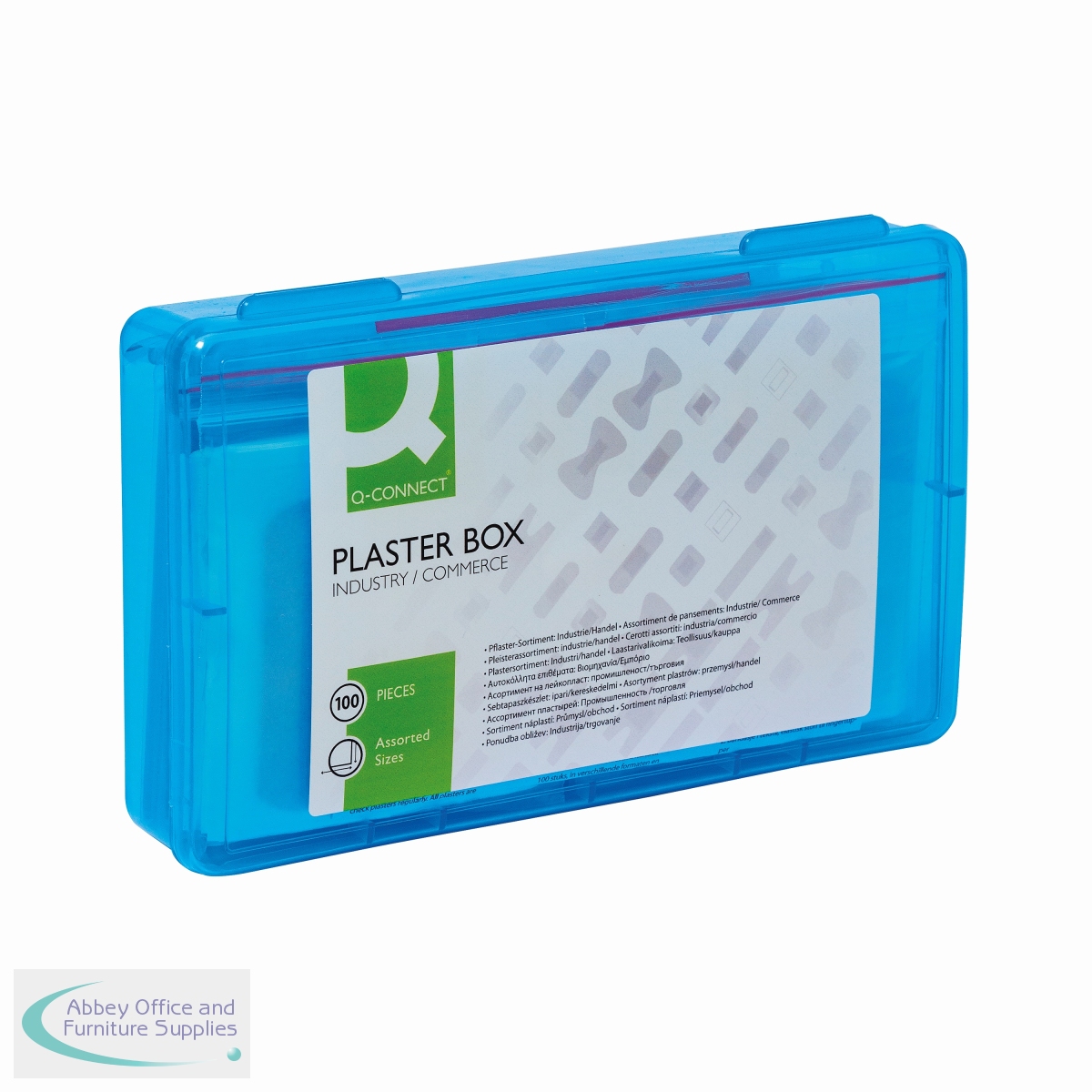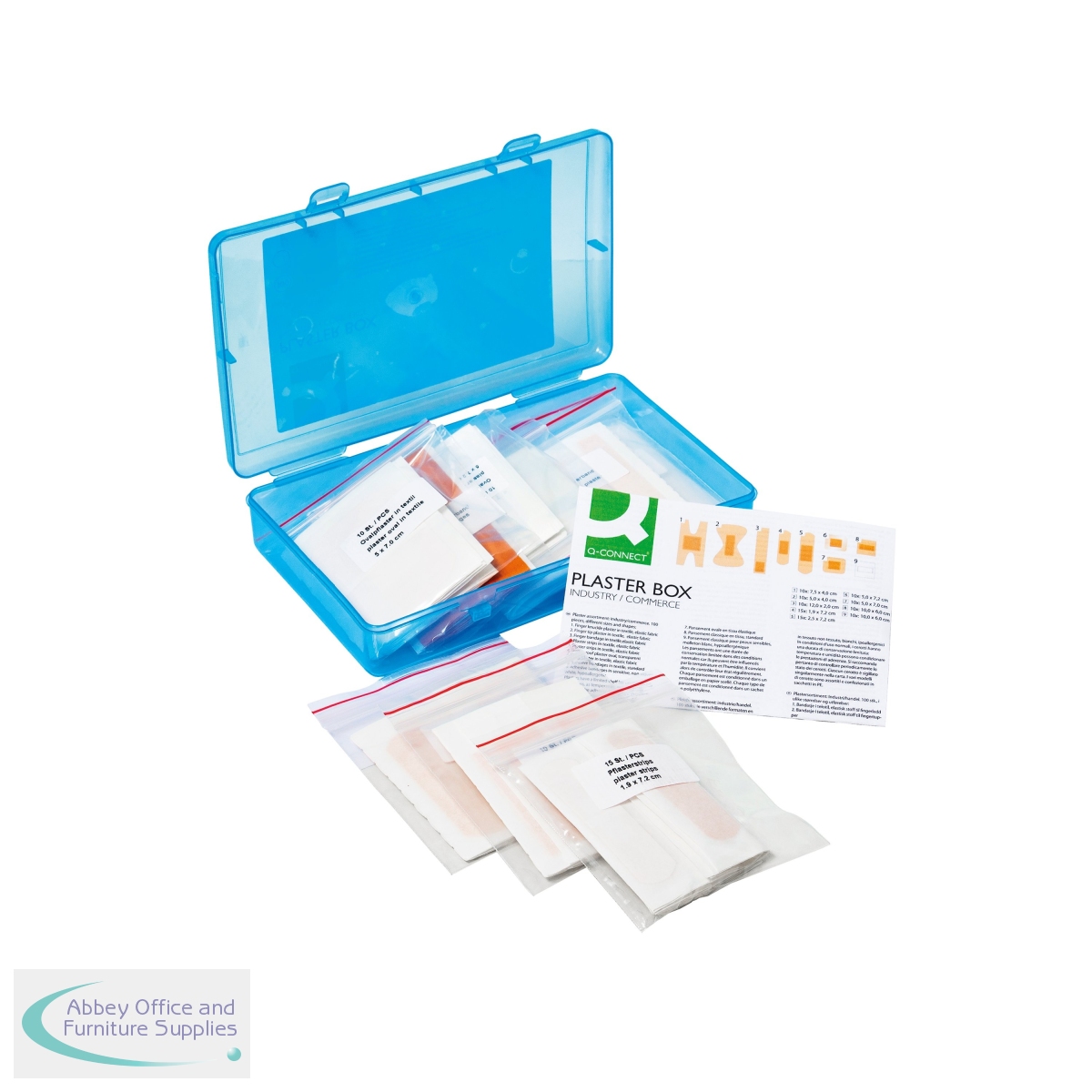 Q-Connect Q-Connect Reclosable plaster box with industry/trade selection of plasters. Handy box with a variety of plasters ideal for minor injuries suffered in industrial and commercial companies. Contains 10x knuckle dressing, 10x fingertip bandage, 15x small plaster, 15x normal size plaster, 10x waterproof oval plaster, 10x oval plaster, 10x quick wound dressing and 10x sensitive quick wound dressing.
