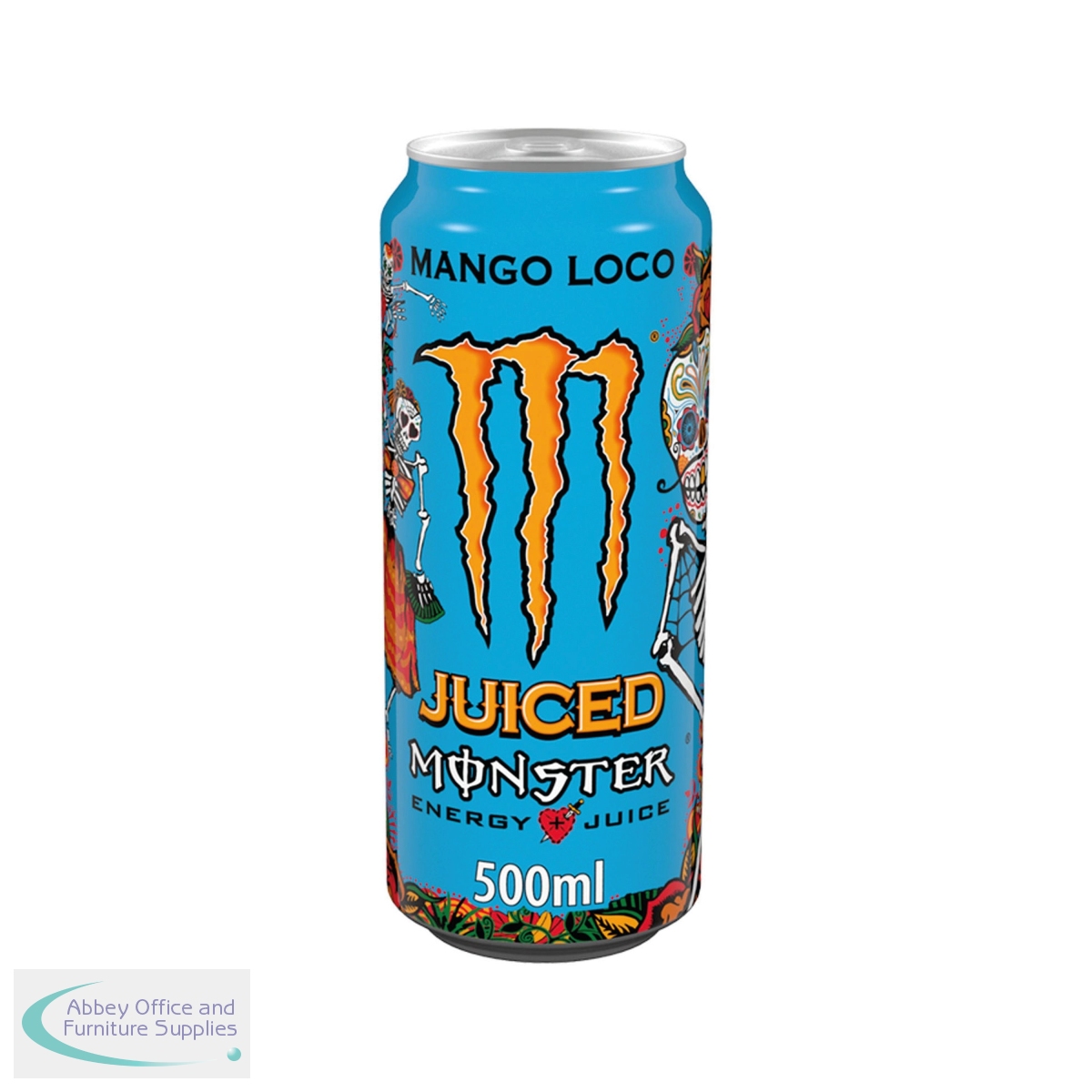 Monster Energy Mango Loco Juiced energy drink is a blend of exotic fruit flavours with an energy blend and 160mg caffeine. The carbonated fruit energy drink contains fruit juice from concentrate. Best served cold for maximum refreshment, these 500ml cans are supplied in a pack of 12.