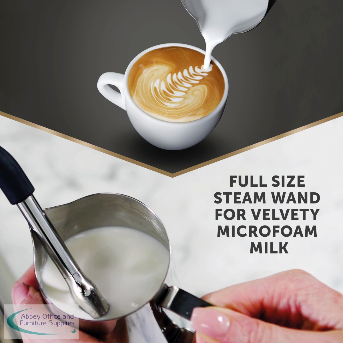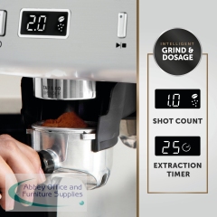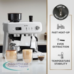 Make delicious coffee with the Breville Barista Max+ Bean to Cup coffee machine. The one-touch Tap & Go Integrated Grinder delivers fresh beans, with a conical burr design for consistent particle size and 30 adjustable grind settings to maximise the flavour of your coffee. Inspired by commercial Espresso machines, Temp IQ Shot Control perfectly regulates the water pressure and temperature, resulting in Barista-level every time. Auto Shot Volumetric Control allows you to choose between one or two shots of Espresso and measures the ideal amount of water, while the Manual Shot button lets you take the reigns and choose the desired volume. The cool touch steam wand finishes hot drinks to perfection, creating velvety smooth micro foam milk that is ideal for Lattes, Flat whites and Cappuccinos.