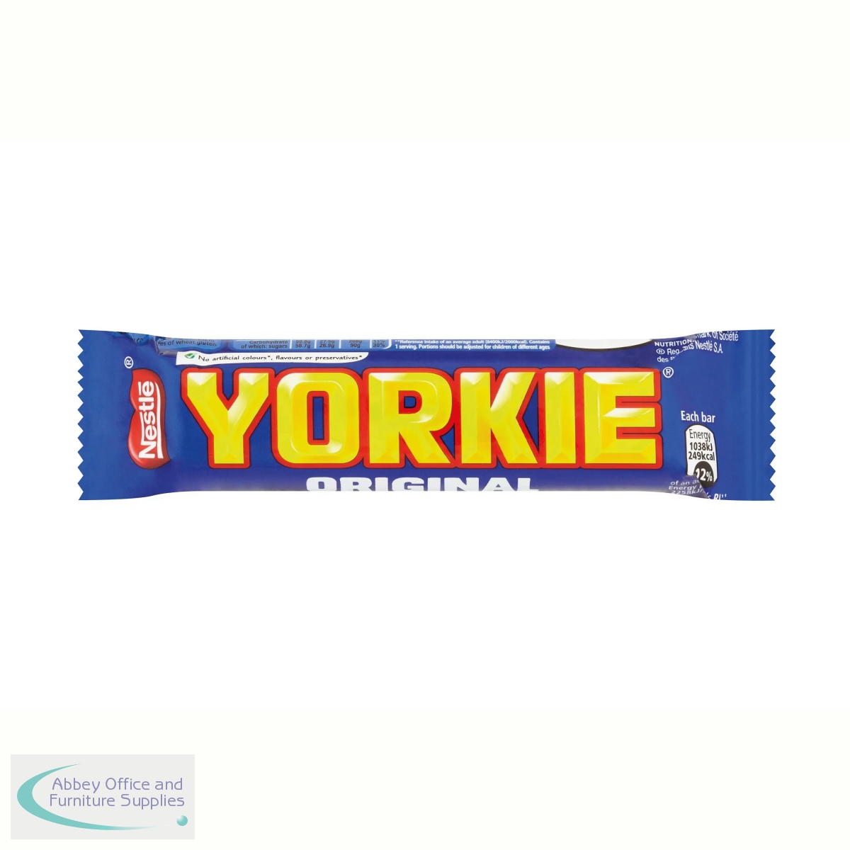 Nestle's Yorkie milk chocolate bar has five solid chunks of smooth, milk chocolate. The thick and satisfying Yorkie chocolate bar is a tasty treat for anyone who needs a seriously chocolatey fix. Each 46g bar is naturally free from artificial colours, flavours or preservatives and this bulk pack contains 24 bars.