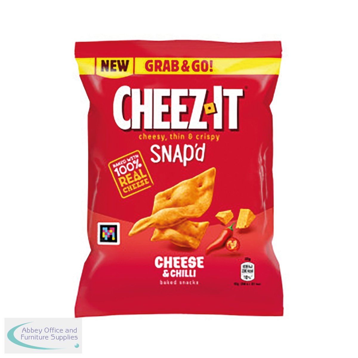 Cheez-It Snap'd Cheese and Chilli are cheesy baked snacks with initial creamy, salty and red chilli notes, followed by mature cheese, then finished with a medium level of heat. These baked snacks are flavoured with 100% real cheese. Supplied in a pack of 20 bags, each containing 40g.