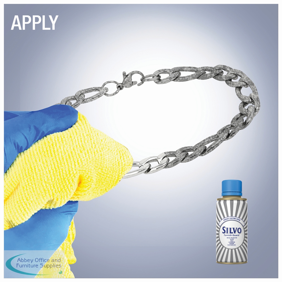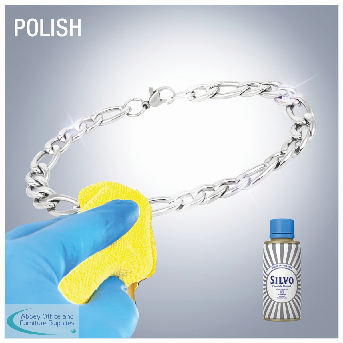 Using Silvo metal polish liquid provides a longer lasting shine for precious Metals - can be used on silver, gold, aluminium, chrome and electroplate. A traditional product which is easy to use and leaves you with excellent results. Directions: Shake well apply with a soft cloth. Polish off with a dry soft cloth before polish has completely dried.