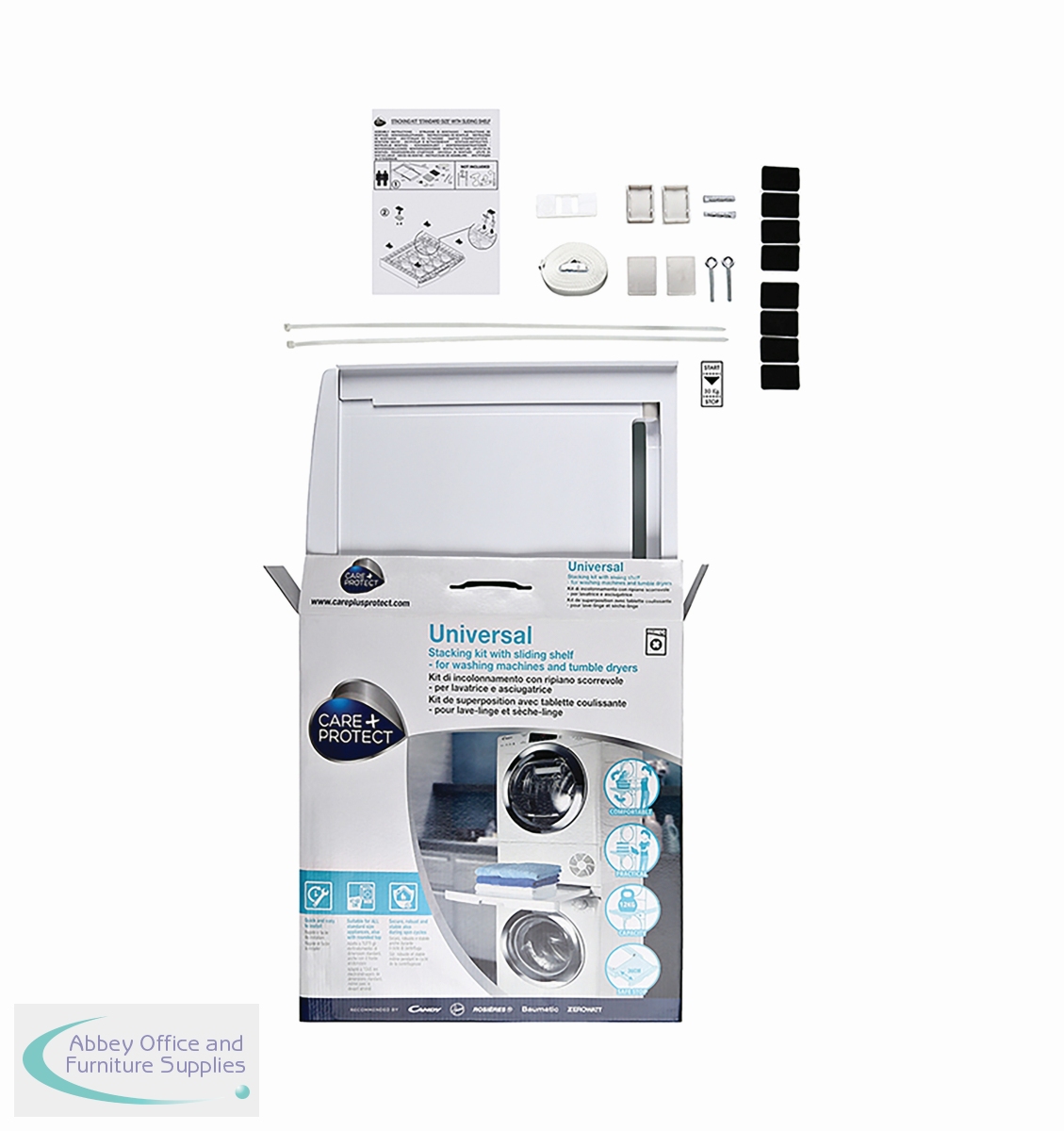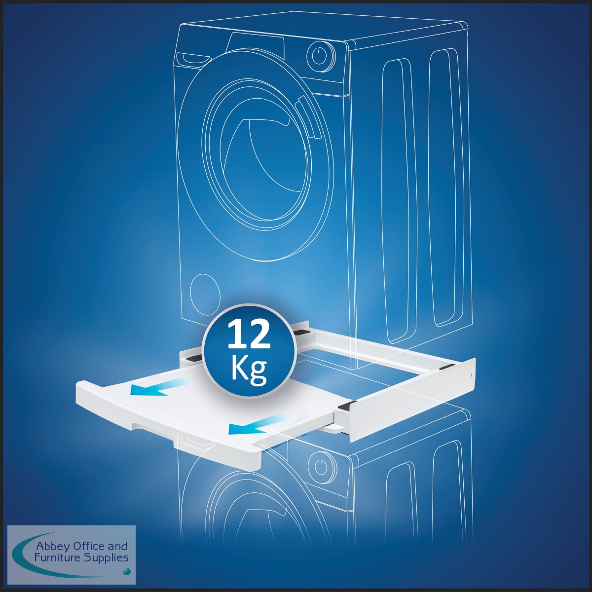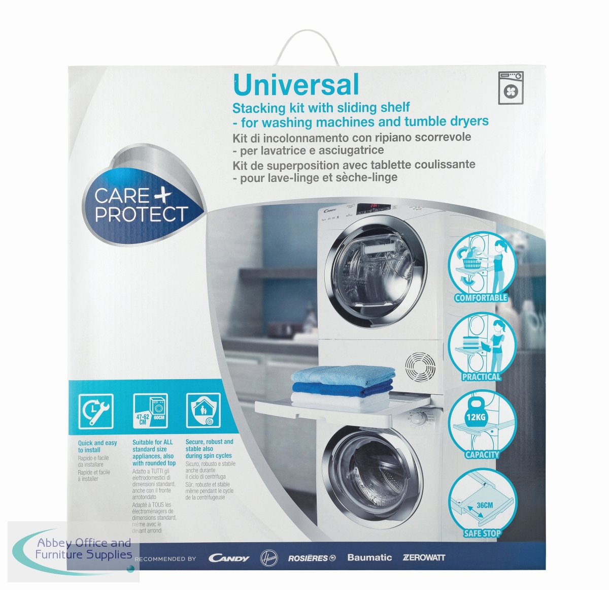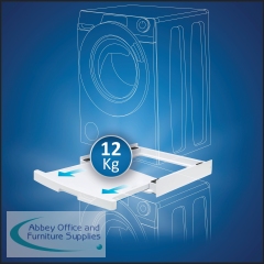 Universal Stacking Kit with sliding shelf. Stable and secure space saving design for all standard sizes of washing machines and tumble dryers. The practical sliding shelf, with a safe stop and anti-tipping system, holds up to 12kg and makes loading and unloading easier.