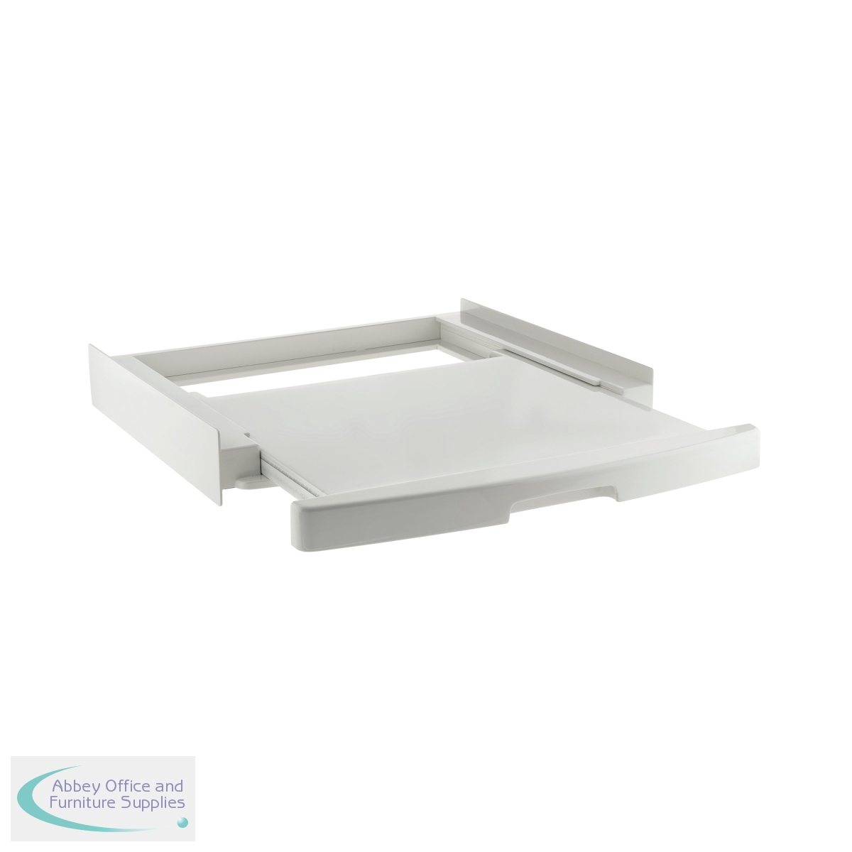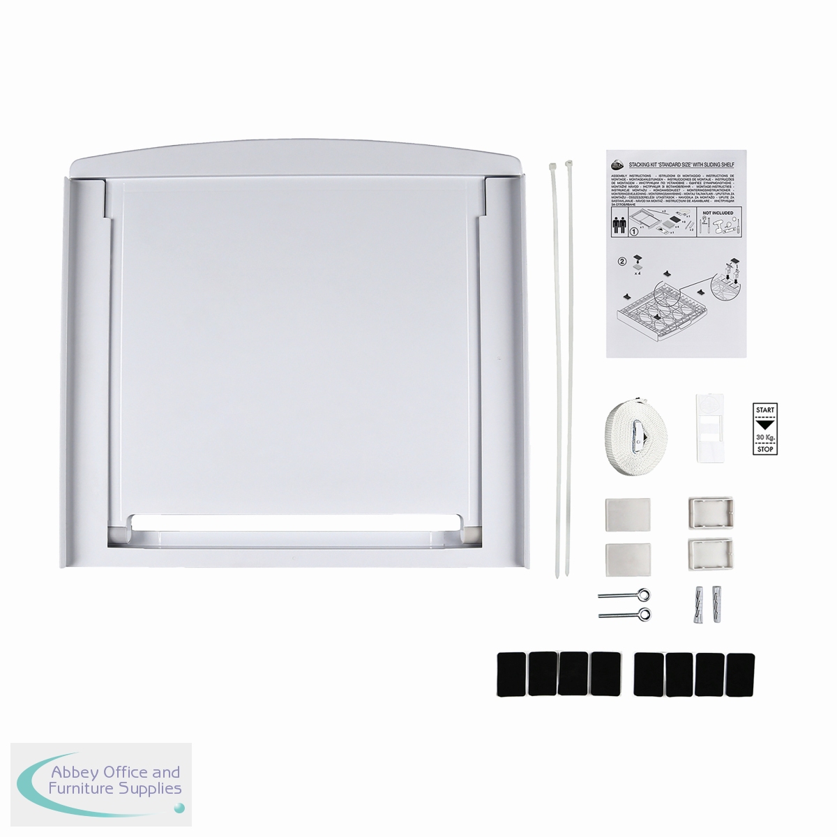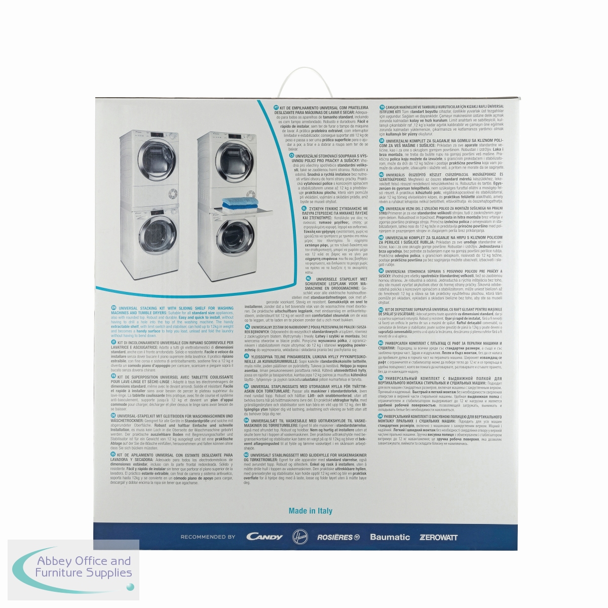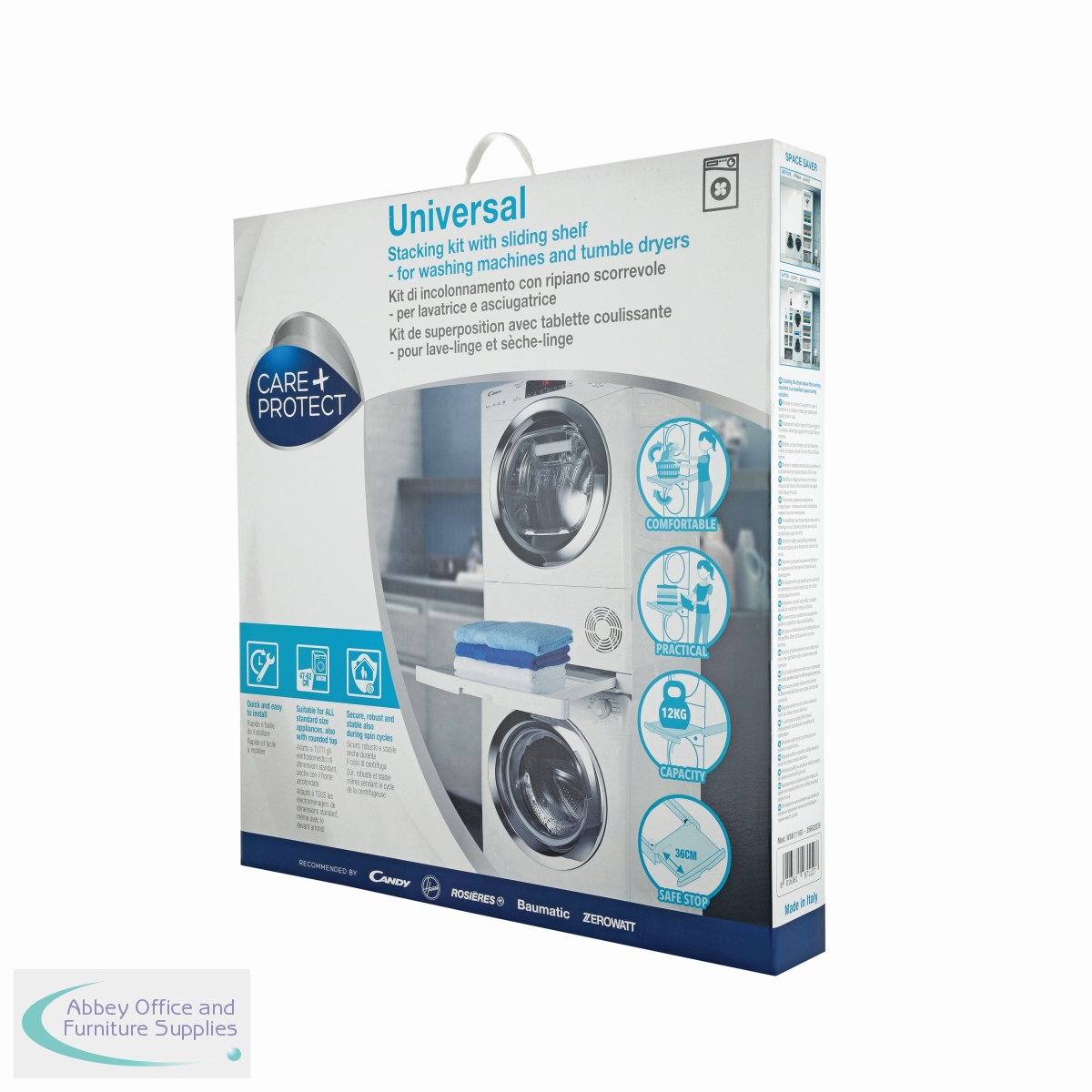 Universal Stacking Kit with sliding shelf. Stable and secure space saving design for all standard sizes of washing machines and tumble dryers. The practical sliding shelf, with a safe stop and anti-tipping system, holds up to 12kg and makes loading and unloading easier.