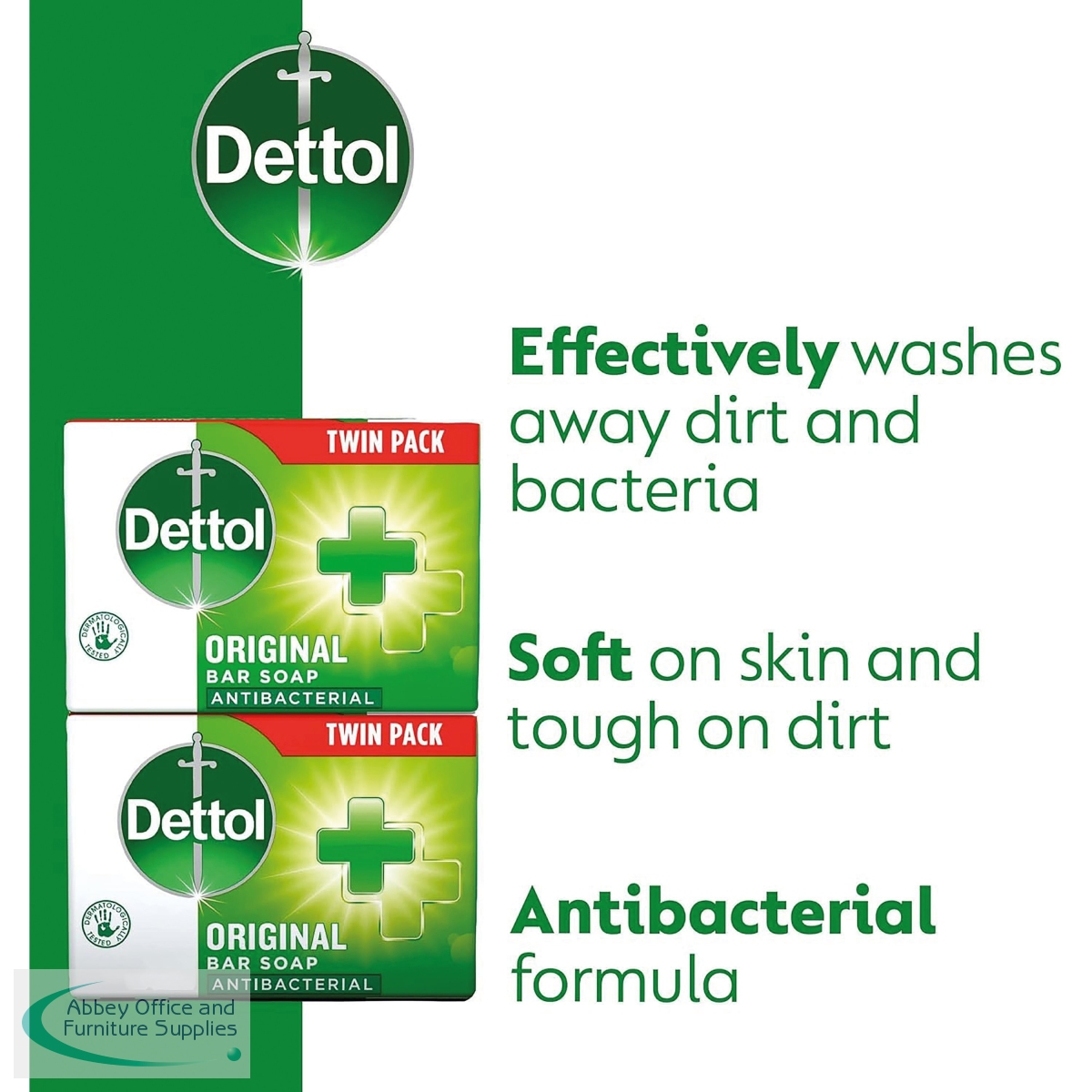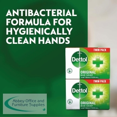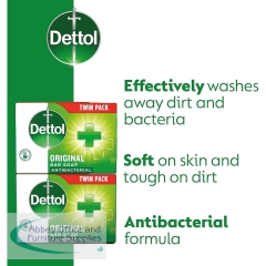 Dettol Antibacterial Original Bar Soap is a gentle soap with antibacterial action to wash away dirt and bacteria. Dermatologically tested and suitable for the whole family, this bar soap is formulated with moisturising ingredients and pine fragrance to leave you feeling clean and refreshed all day. Supplied in twin packs. 2 bars per twin pack. 6 packs supplied.