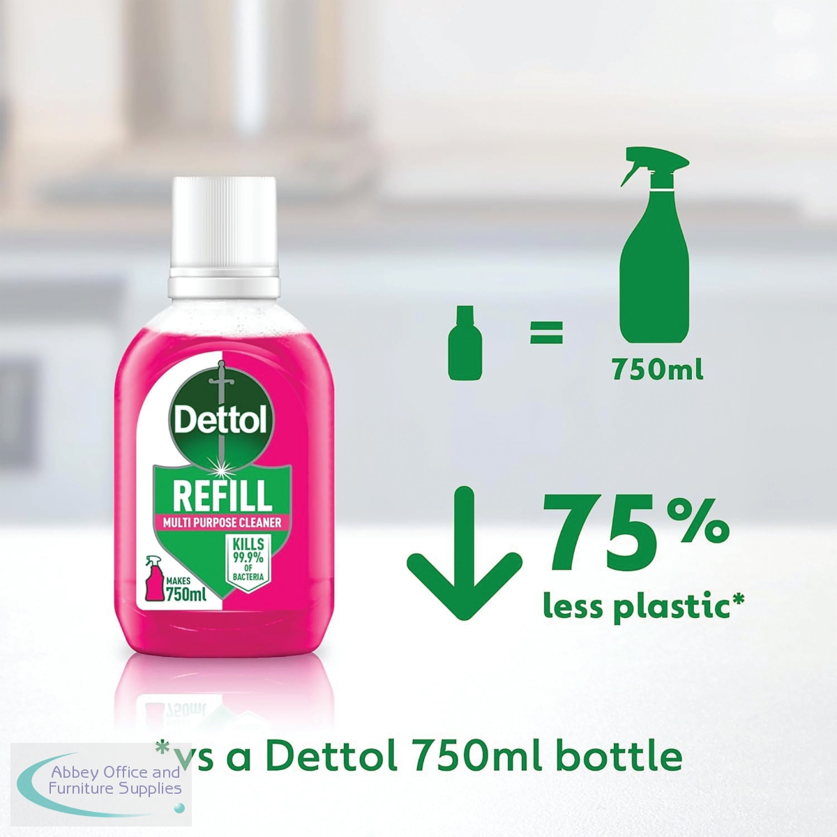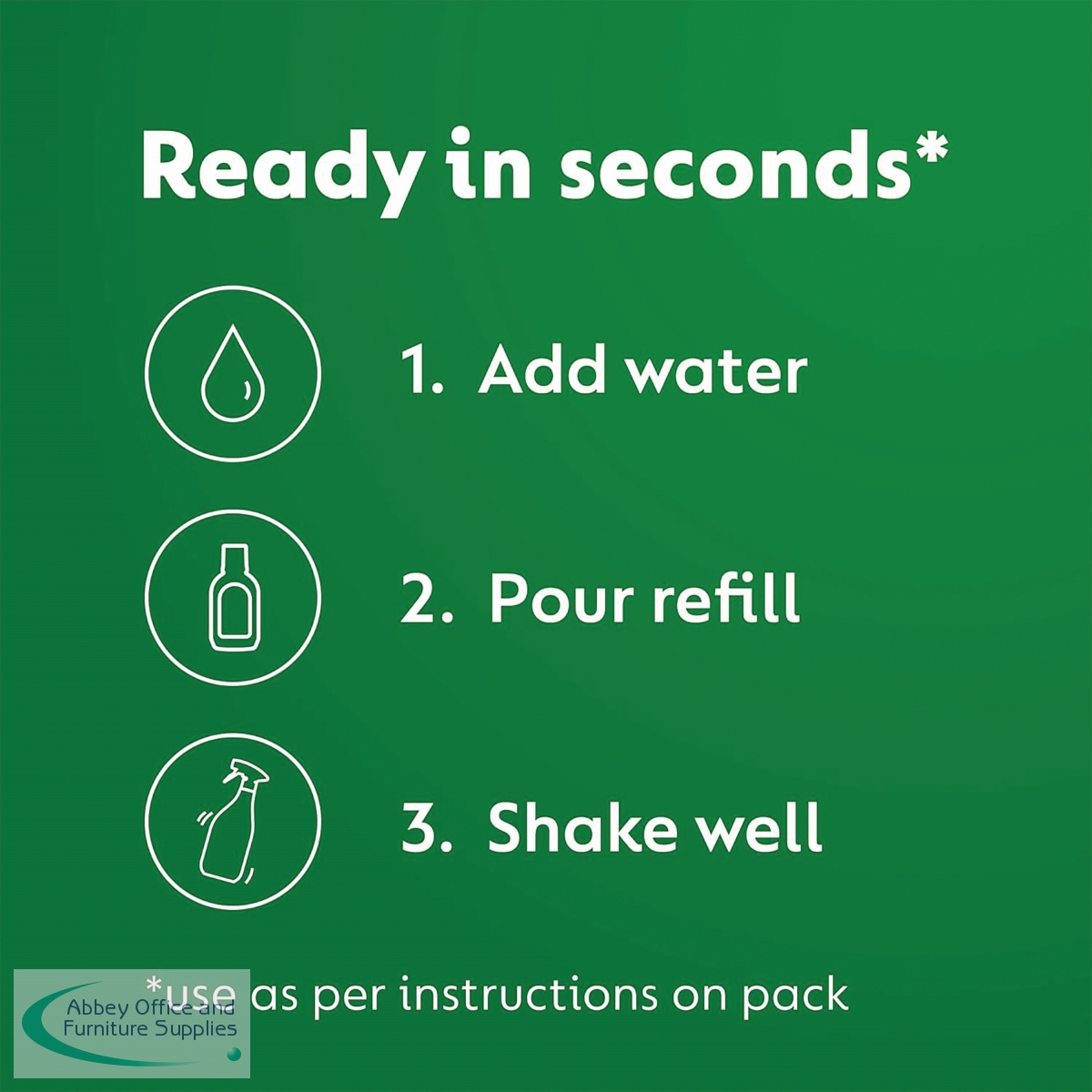 Dettol Multi Purpose Cleaner Refill Pomegranate is ready in seconds to kill 99.9% bacteria, whilst using 75% less plastic vs the 750ml trigger. Simple to prepare, recycling an existing 750ml spray bottle, pour the entire 50ml into the spray bottle, simply dilute with 700ml water, snap-on trigger, give it a gentle shake and you are ready to go.