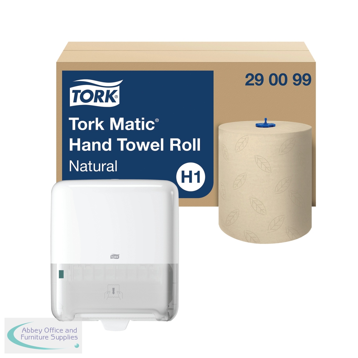 Tork Matic Paper Hand Towel Roll Natural H1: Ideal for high-frequency washrooms, this paper hand towel roll will pamper your guests, allowing them to dry their hands gently and thoroughly. The light brown colour comes from using recycled cardboard boxes as one of the fibre sources. No dyes are added in the paper-making. Low maintenance. This promotion includes a FREE Dispenser.