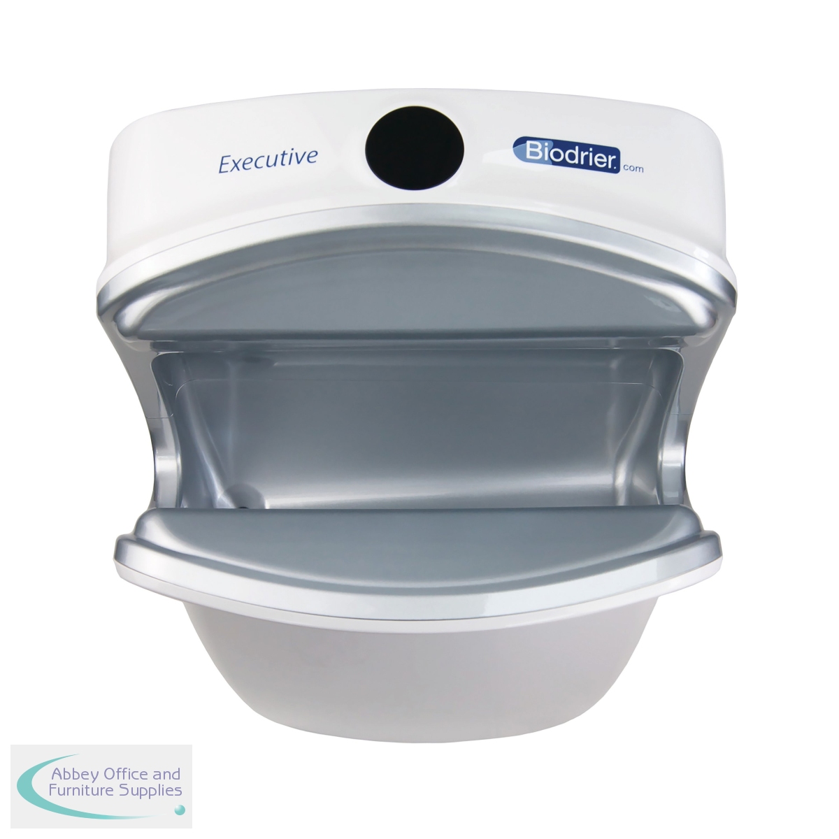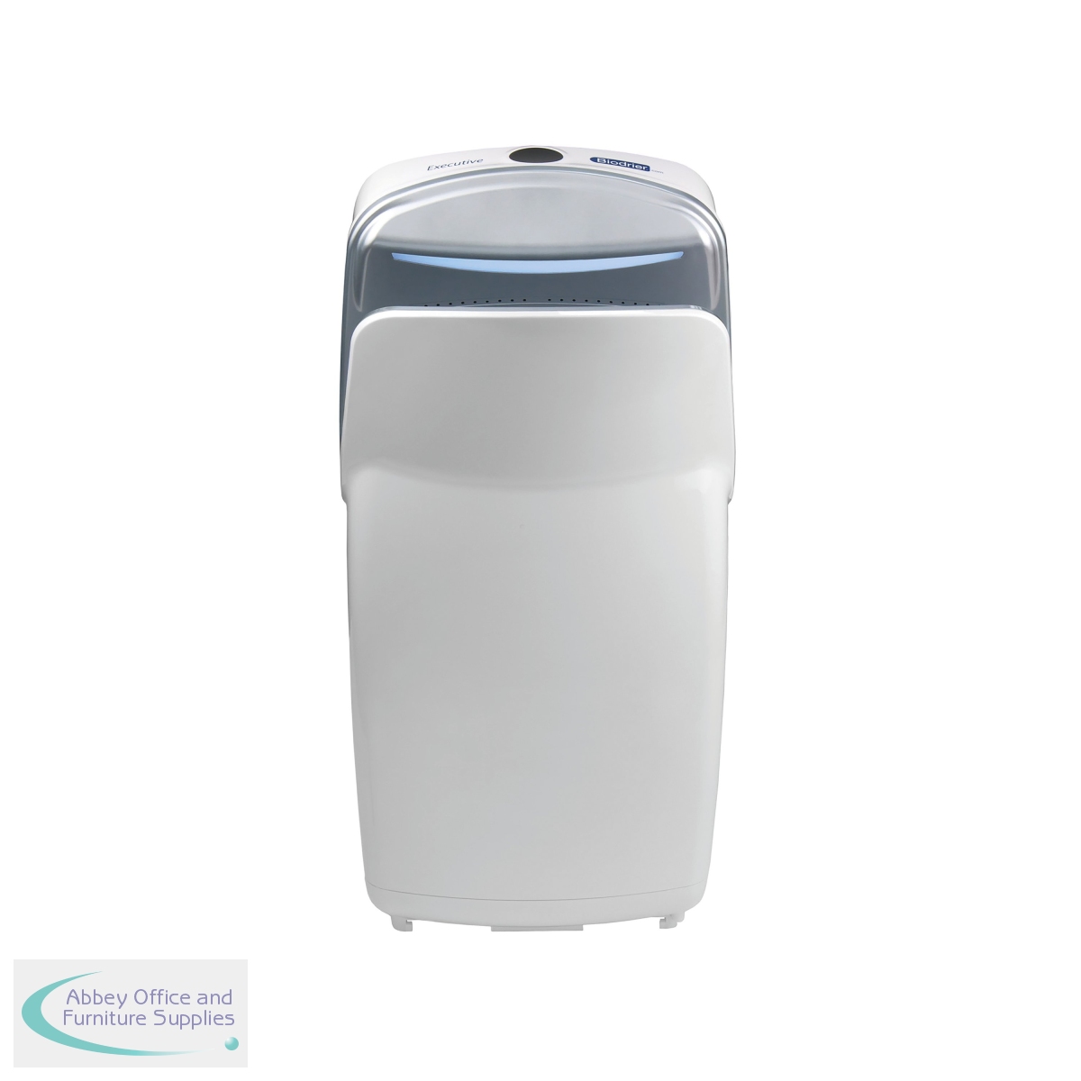 The Biodrier Executive is packed with features that make it sophisticated. Its contemporary design add a high-quality finish to any executive washroom. The LED display on top of the dryer counts down the hand drying time and indicates when the drip tray and HEPA filter need to be changed. Detecting hands with accuracy, it uses three infrared sensors, eliminating false or delayed hand detection, starting to dry when needed. No contact is needed to activate the unit which reduces bacteria transfer. A Noise Absorption Module inside the unit minimises air friction and mechanical sounds from the motor. The two-stage motor reduces noise levels down to just 58dba @ 1meter. Based on a simple yet powerful idea, using the heat from its own motor to provide the warm air used to dry your hands, this dryer saves energy compared to a traditional hand dryer. The Biodrier Executive uses two jets of air to remove water from the hands, one for the top and one for the bottom. This dries the hands in under 10 seconds and the new high-speed brushless motor, saves users money in consumption and future maintenance costs. The motor also saves energy as it consumes only 700 watts of power. The unit filters air through a triple HEPA Grade 13 filter which removes 99.9% of all airborne particles and makes sure hands are dried with clean, germ-free air. The hygienic filter system consists of a pre-filter, an antibacterial filter and HEPA filter. These protect against bacteria and help combat viruses. Infused with our exclusive Organic Gel Blocks which moisturise hands, freshen the surrounding air of the room and sanitize the hand dryer unit all at once. The Antibacterial UV Transforms by eradicating all offensive odours, eliminating bacteria, and controlling infection. The water is collected in a drip tray in the bottom of the unit, keeping the surrounding area clean and safe and prolonging the life of the dryer. The outer shell is made from advanced ABS plastics which is hard wearing, burn proof, rust proof, and has a Ionpure anti-microbial coating. Supplied in white.