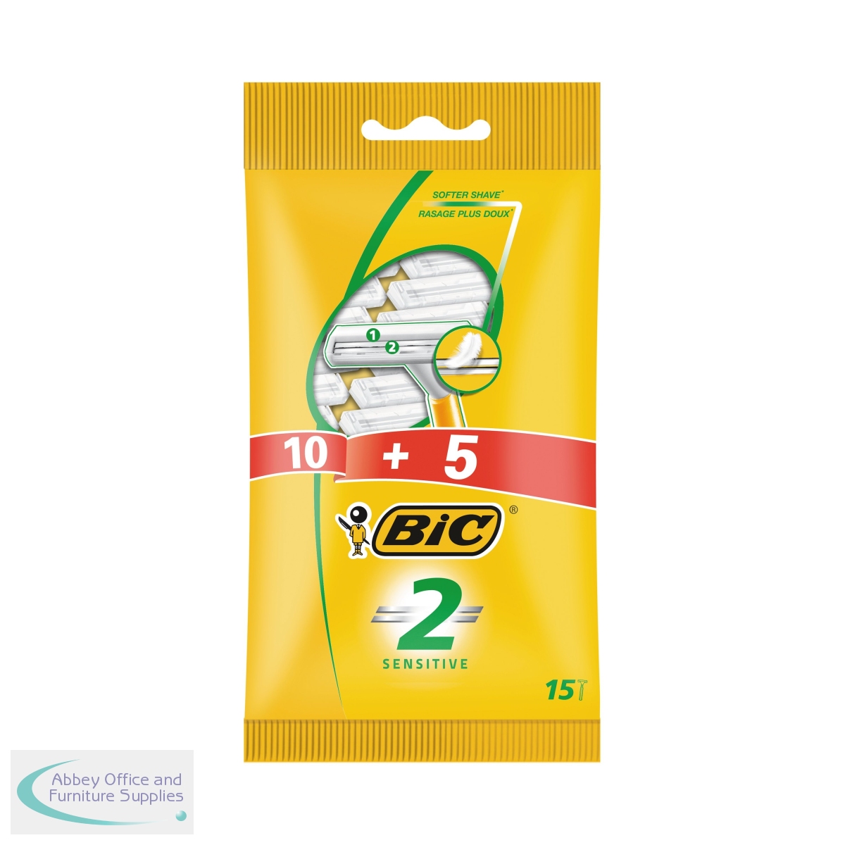 A pack of 15 (10 plus 5 extra) BIC 2 Sensitive disposable twin-blade razors for men that offer good value with��two stainless steel blades and a long handle for accurate control. Eliminate the stubble and enjoy a quick no-nonsense shave.