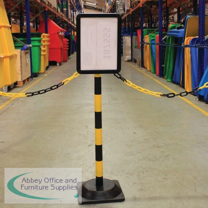 Post and A4 Sign Holder is ideal for use as a temporary or permanent solution to communicate hazards and dangers. Suitable for walkways, car parks or warehouses. Signs simply slide into the frame which attaches to the plastic post. Plastic chains and additional posts are also available separately. Suitable for pedestrian control.