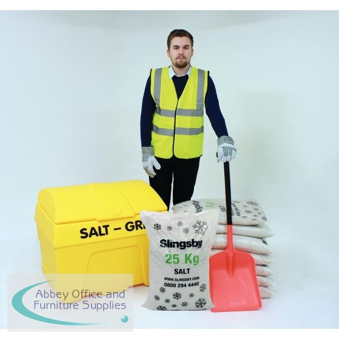 Winter Snow and Ice Clearance Starter Kits Yellow. Handy essentials to ensure you are best prepared for icy conditions. Kit consists of a 200L salt and grit bin, 8 x 25kg bags of salt, 1 x large snow shovel, 1 x high visibility vest and 1 pair of winter gloves.