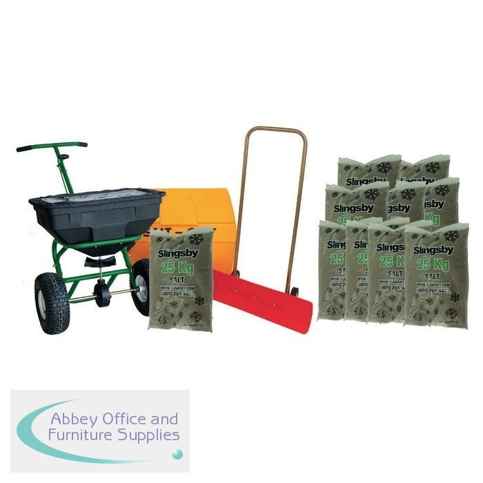 Car Park Winter Snow and Ice Clearance Kit includes 200 litre salt and grit bin without hopper, heavy duty salt spreader, snow plough and 10 x 25kg bags of white de-icing or brown rock salt. Snow plough is light, easy and safe to use its plastic blade is bi-directional pushing the snow the same way with every pass. 57kg capacity salt spreader, comes with rain cover and hopper screen, adjustable gearbox, stainless steel handle for extra corrosion protection and fitted with directional flaps to adjust the spread from open space to pathway (up to 3 metres). Please note you will require offloading facilities for this product, for more information call us on 0800 294 4440.