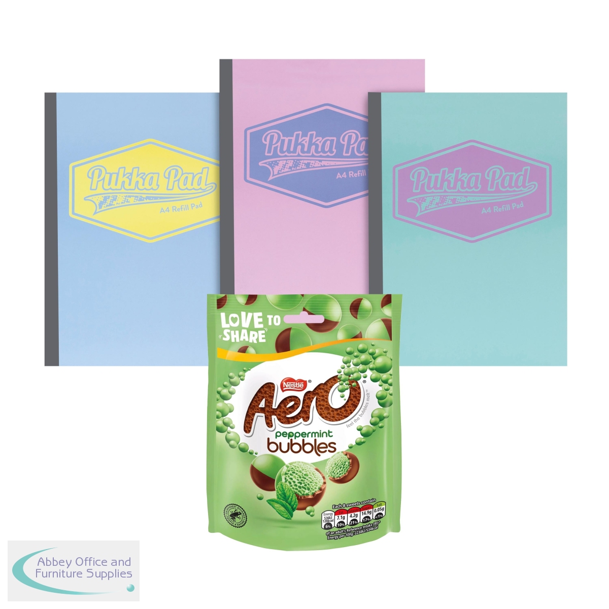 A fun and colourful addition to your essential stationery, this pack of three Refill Pads comes from Pukka Pad's Pastel Range. In three stylish colours, pink, teal and blue, the pads include 400 pages of premium quality 80gsm paper with 8mm lines and margins. Each pad is side bound and four-hole punched, making them ideal for use in ring binders and lever arch files. This promotion includes a FREE 92g sharing bag of Nestle Aero Bubbles Peppermint Milk Chocolates.