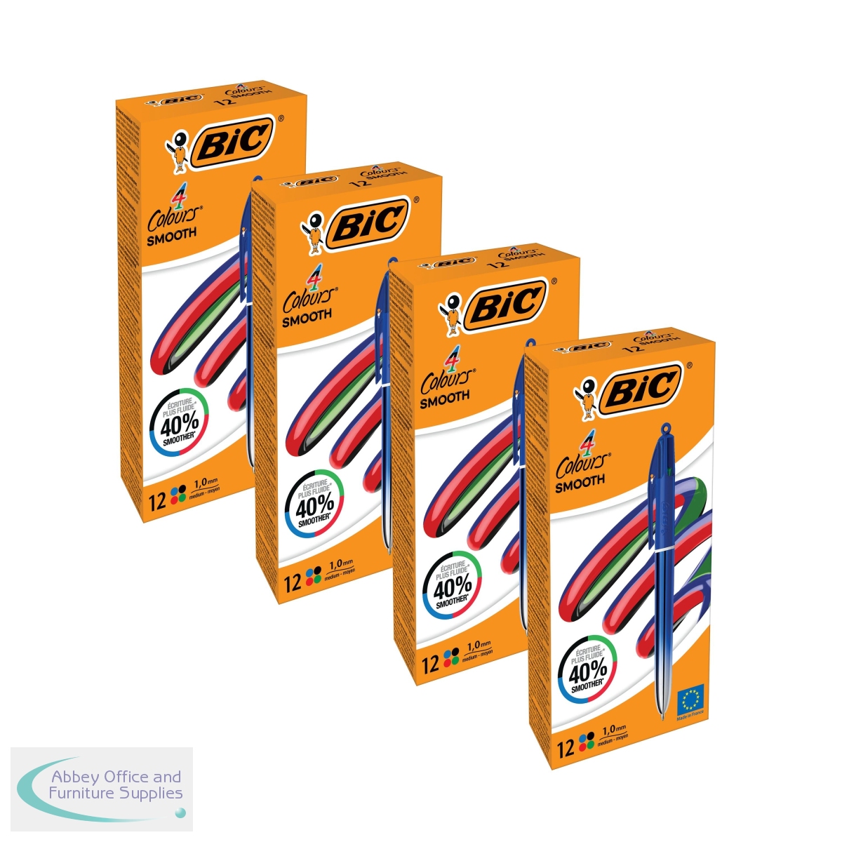 The legendary BIC 4 Colours ball pen is now smooth like a gel pen for the smoothest BIC 4 Colours experience with 40% smoother ink. This pack contains 12 versatile BIC 4 Colours Smooth pens that glide across the page with 4 medium 1.00mm points in blue, black, red, and green. Ideal for everyday writing tasks with the same iconic features as the original BIC 4 Colours pen (round barrel, side clip, and click buttons). Enjoy the trendy and shiny gradient barrel in blue. This promotion includes 4 packs of 12 pens for the price of 3 (48 pens in total).
