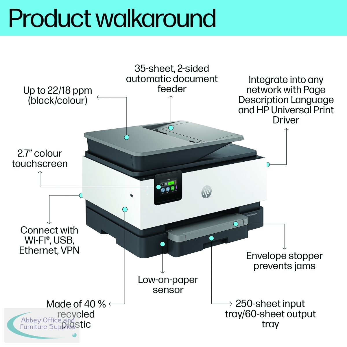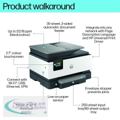 The professional colour inkjet printer for distributed offices and hybrid workforce from HP. Always ready for high volumes, this HP OfficeJet Pro printer comes equipped with a 250-page input tray. Avoid waiting by the printer with an automatic document feeder enabling double-sided scanning. This printer is intended to work only with cartridges that have a new or reused HP chip, and it uses dynamic security measures to block cartridges using a non-HP chip. Periodic firmware updates will maintain the effectiveness of these measures and block cartridges that previously worked. A reused HP chip enables the use of reused, remanufactured, and refilled cartridges.