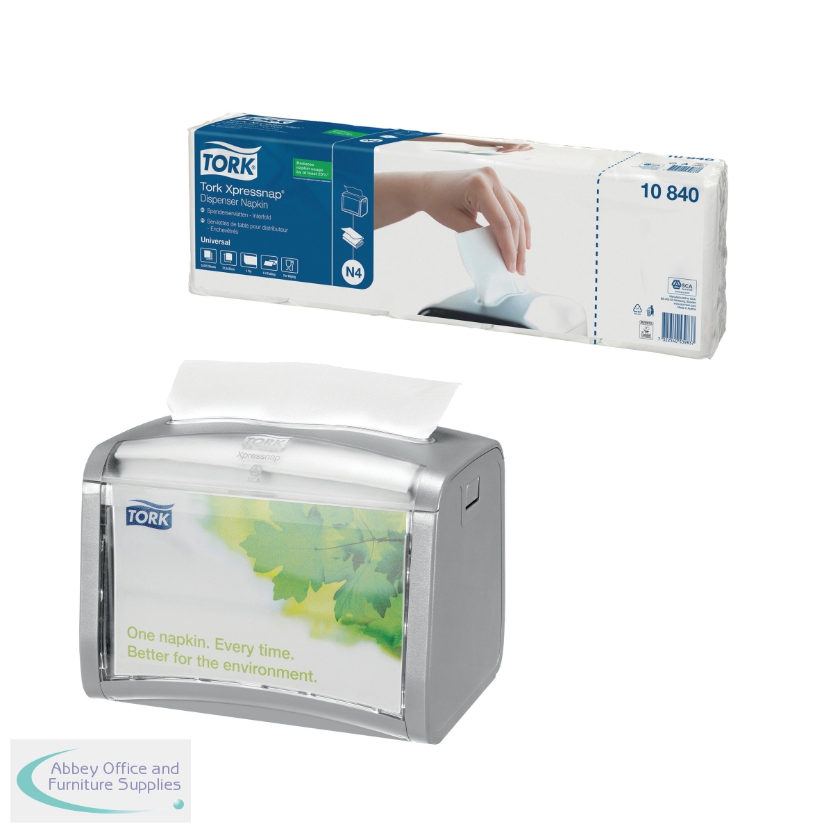 Tork Xpressnap White Dispenser Napkin: When guests take too many napkins and discard them, your self-service area can look messy and dispensers need frequent refills. Tork Xpressnap dispensing systems help reduce napkin consumption in your establishment by at least 25% compared to traditional napkin dispensers. Packed in plastic covering for improved hygiene and easy storage, they're simple to replace to save staff time. This promotion includes a FREE Tork Silver Xpressnap tabletop napkin dispenser.