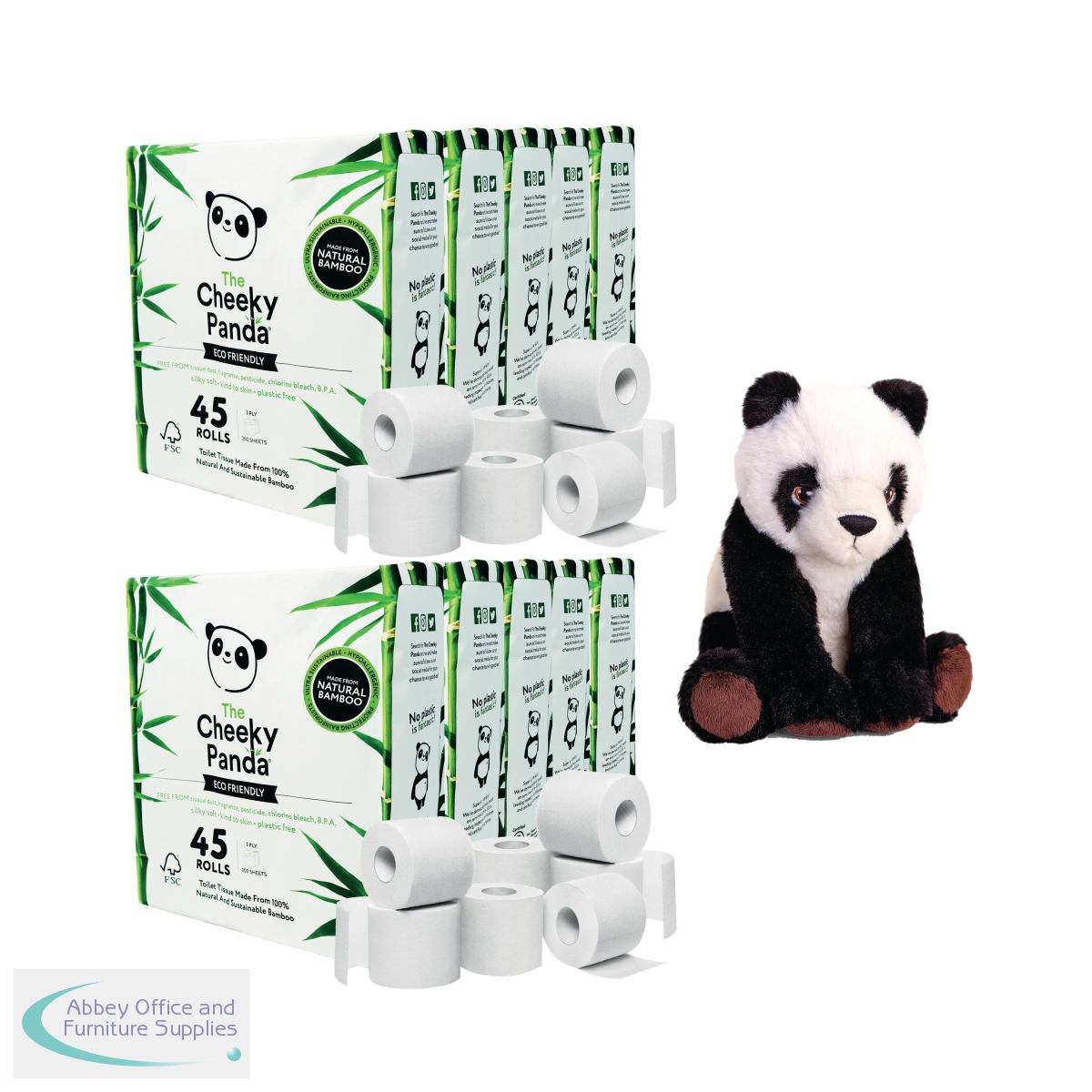Made from sustainable bamboo, these soft and strong toilet rolls are kind to the skin. The Bamboo is sustainably sourced and the packaging is 100% plastic free. Supplied as 5 packs of 9 rolls, 45 rolls total quantity, each roll contains 200 sheets. This promotion includes 2 packs of 45 plus a FREE Panda soft toy.