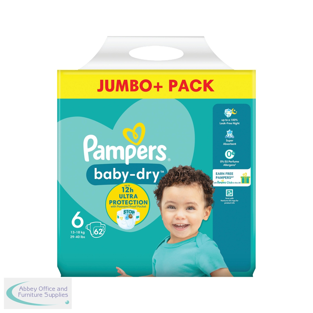 Pampers Baby Dry Taped Nappies have an extra absorbent layer to give your baby up to a 100 per cent leak-free night. With safety leg cuffs and a Stop and Protect pocket, these features are designed to give additional protection against leaks around the legs and back. The nappies also include a super absorbent core with stretchy side wings to give babies added comfort. Pampers Baby Dry Nappies are dermatologically tested and contain 0 percent EU perfume allergens as well as being tested and certified according to Standard 100 by OEKO-TEX. These size six nappies come in a twin pack of 62 (124 nappies in total).