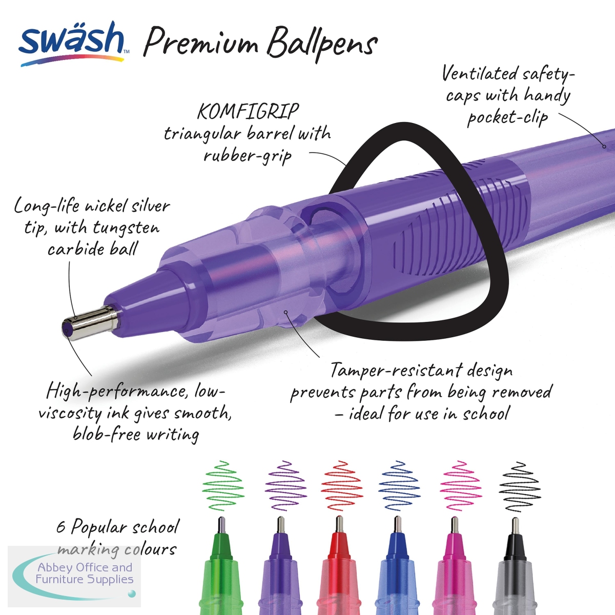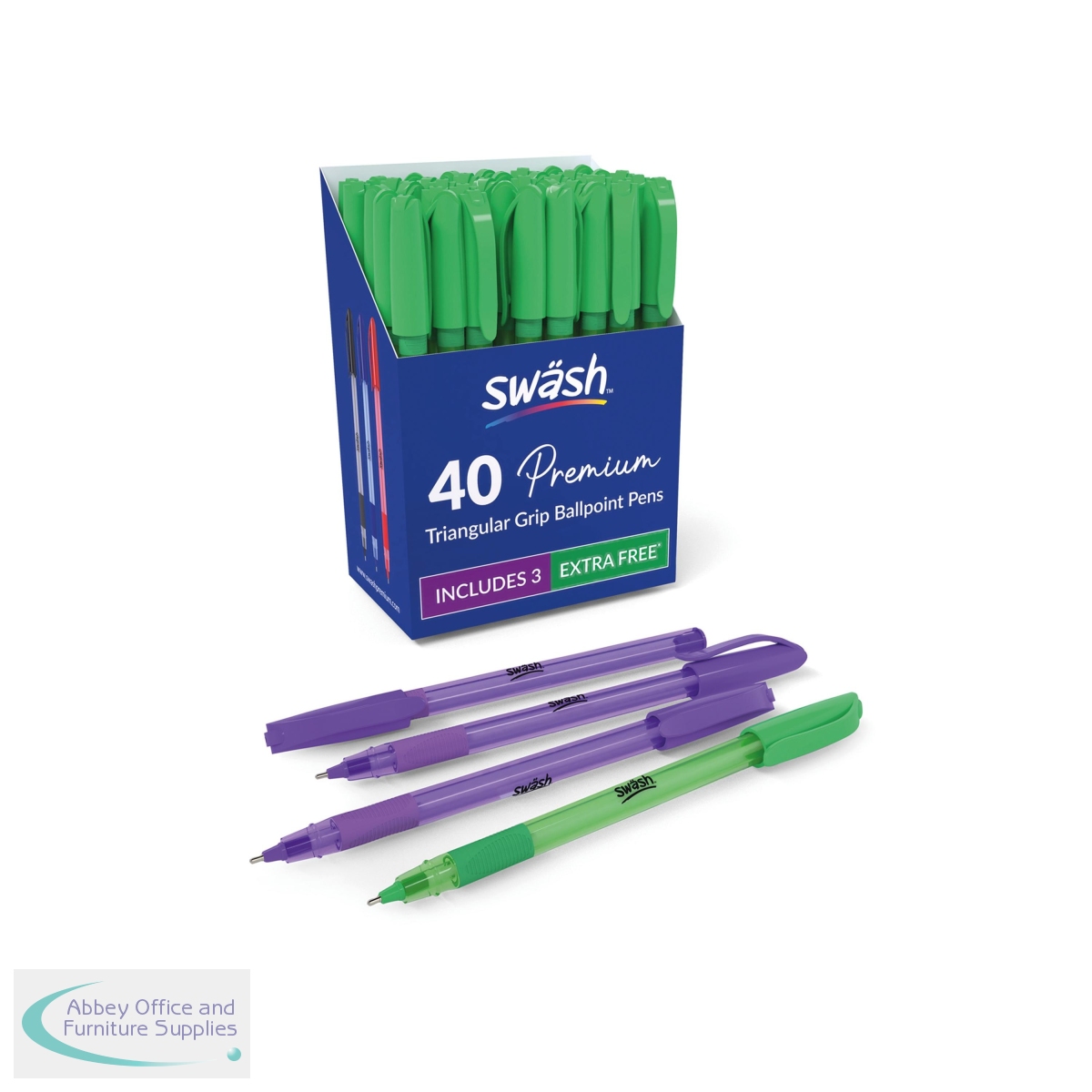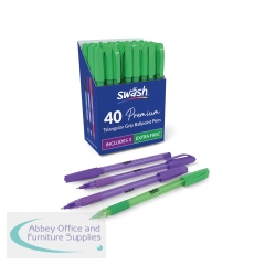 These Swash pens are dependable, high quality ballpoint pens with a medium tip and rubber grip. Its comfortable rubber-grip and triangular barrel are perfect for short or long term use. Perfect for teachers and students, marking work; offices and business; or anyone wanting their notes to stand out for general sketching or a bright and vivid writing style. Supplied in a pack of 43 pens (40 green and 3 purple).