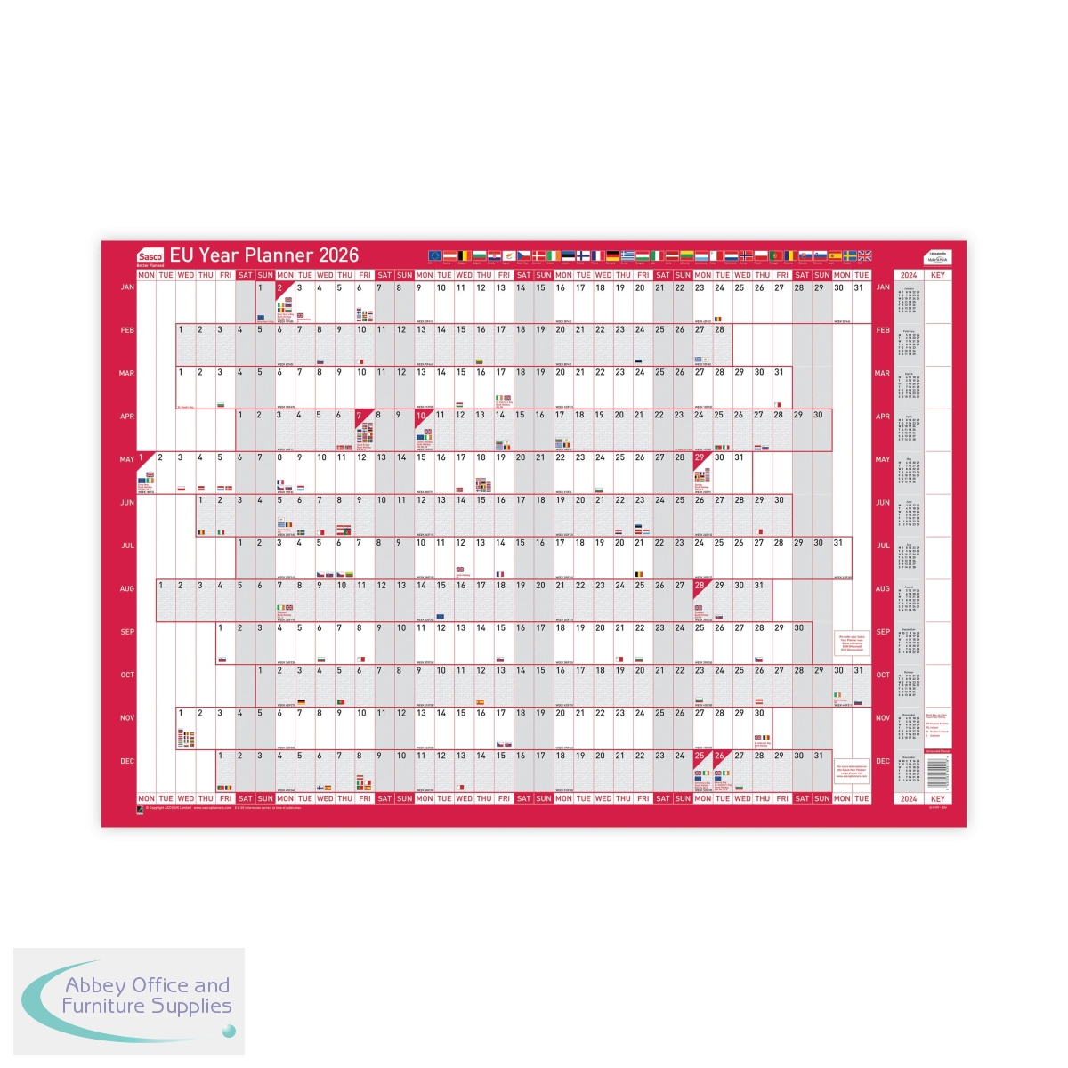 This Sasco EU Year Planner includes all EU public holidays, clearly marked with the relevant nation's flag and UK and ROI bank holidays. Ideal for anyone working in a pan-European environment, this handy planner allows you to organise meetings, staff holidays and more for a full year. The planner is laminated for you to write on with a whiteboard marker, which can easily be wiped off to make changes. This planner is unmounted and measures W915 x 610mm.