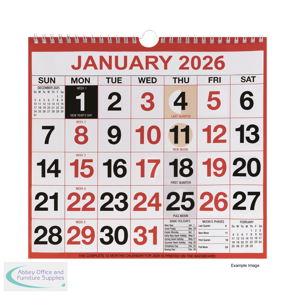 This handy month to view calendar is printed with red and black print for distinctive clear date figures, helping you keep track of your busy work and home life. Printed onto the calendar are UK moon phases, week numbering and all UK and ROI holidays. The calendar has a backing board and is wire bound at the top with a hook to hang it onto a wall. The calendar measures 249 x 231mm.