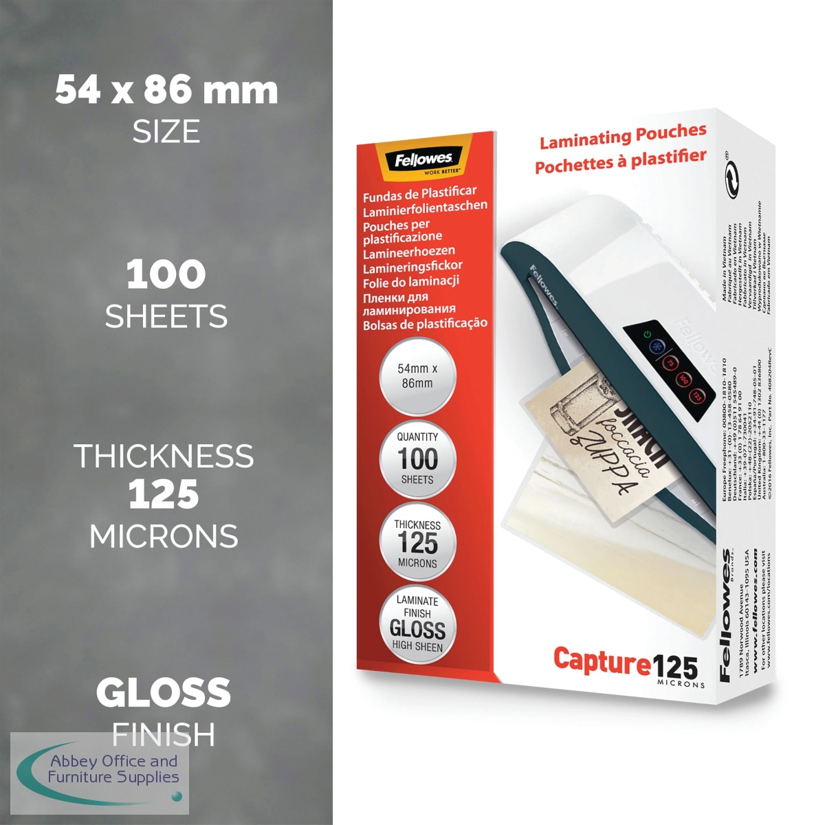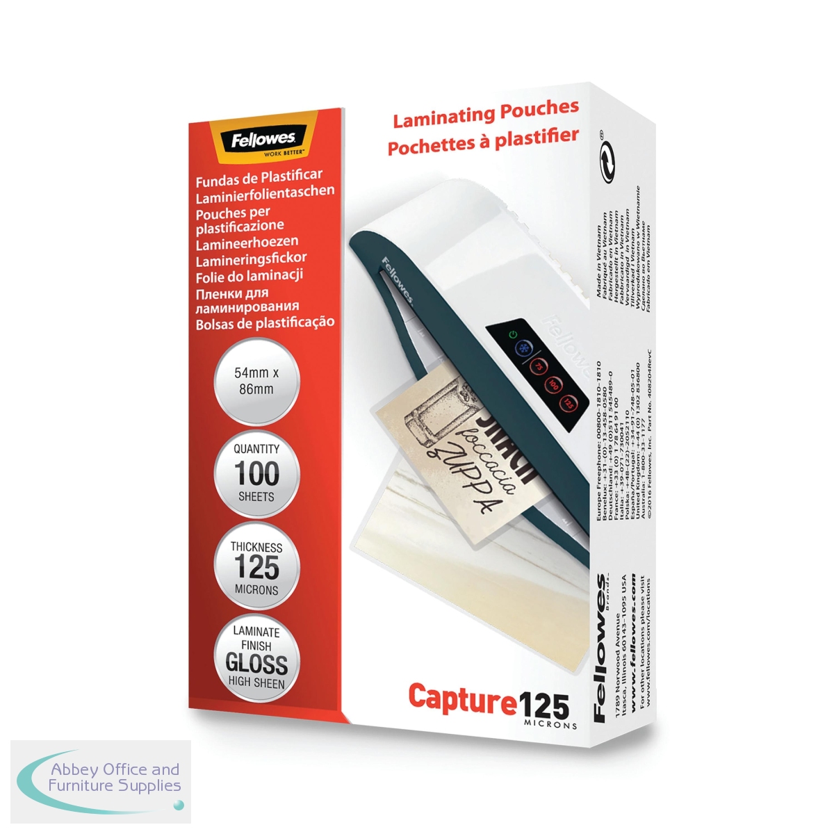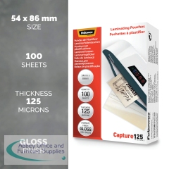 BB53063 - Fellowes 54x86mm Capture Gloss Laminating Pouches 250 Micron (Pack of 100) 53063
