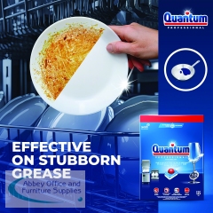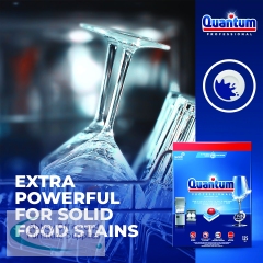 Quantum Professional Dishwasher Tablets have been designed for commercial dishwashers with a washing time of 1-5 minutes and manual dosing. They achieve quick results for a clean and shiny wash result on your glasses, dishes and cutlery.
