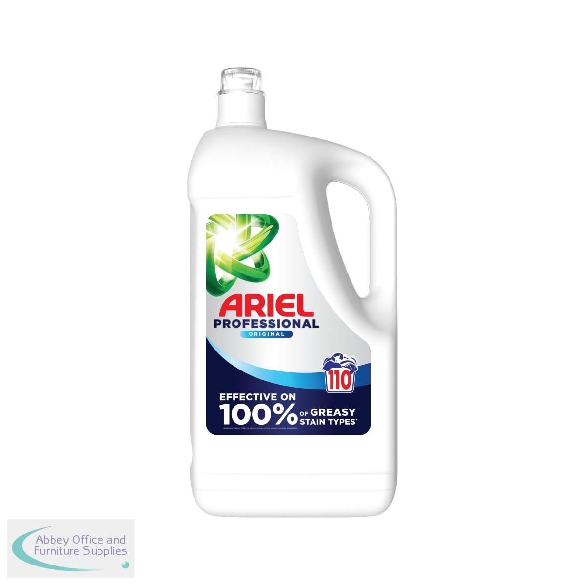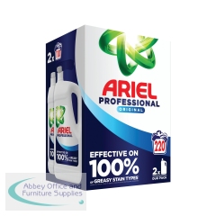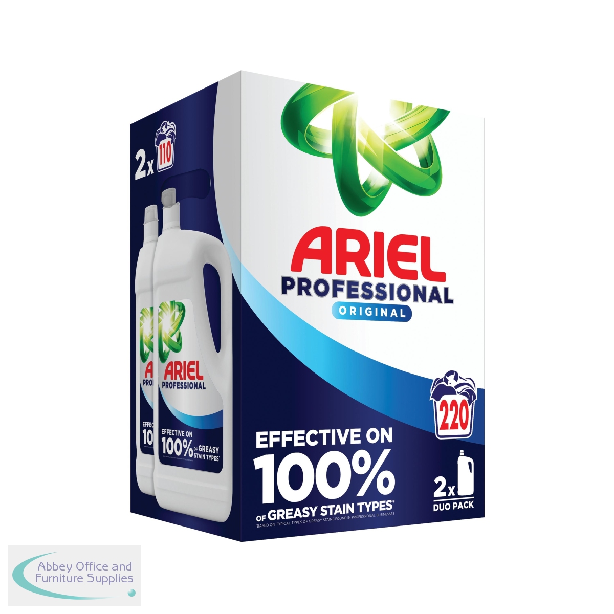 Ariel Professional laundry liquid is effective on all greasy stain types. Removing 100% of greasy stains, this Ariel Original formula washes clothing, leaving it fresh, clean and stain-free. Supplied in a twin pack of 4.95 litres, providing up to 220 washes in total.