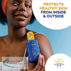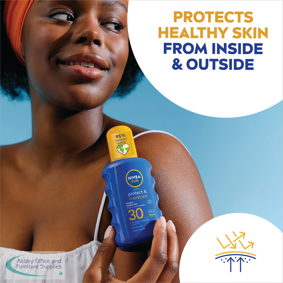 Nivea Sun Protect and Moisture Pump Sun Spray protects healthy skin from inside and outside. It provides immediate UV protection and supports skin protection from inside with anti-oxidative Vitamin E. Keeping skin moisturised for 48 hours. The water-resistant formula is 78% biodegradable and respects the ocean by being free from UV filters Octinoxate, Oxybenzone, Octocrylene and free of microplastic. Product packaging comes with 95% recycled bottle (without cap, pump).