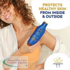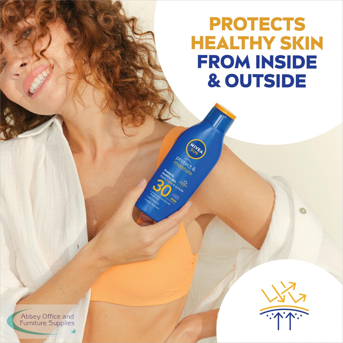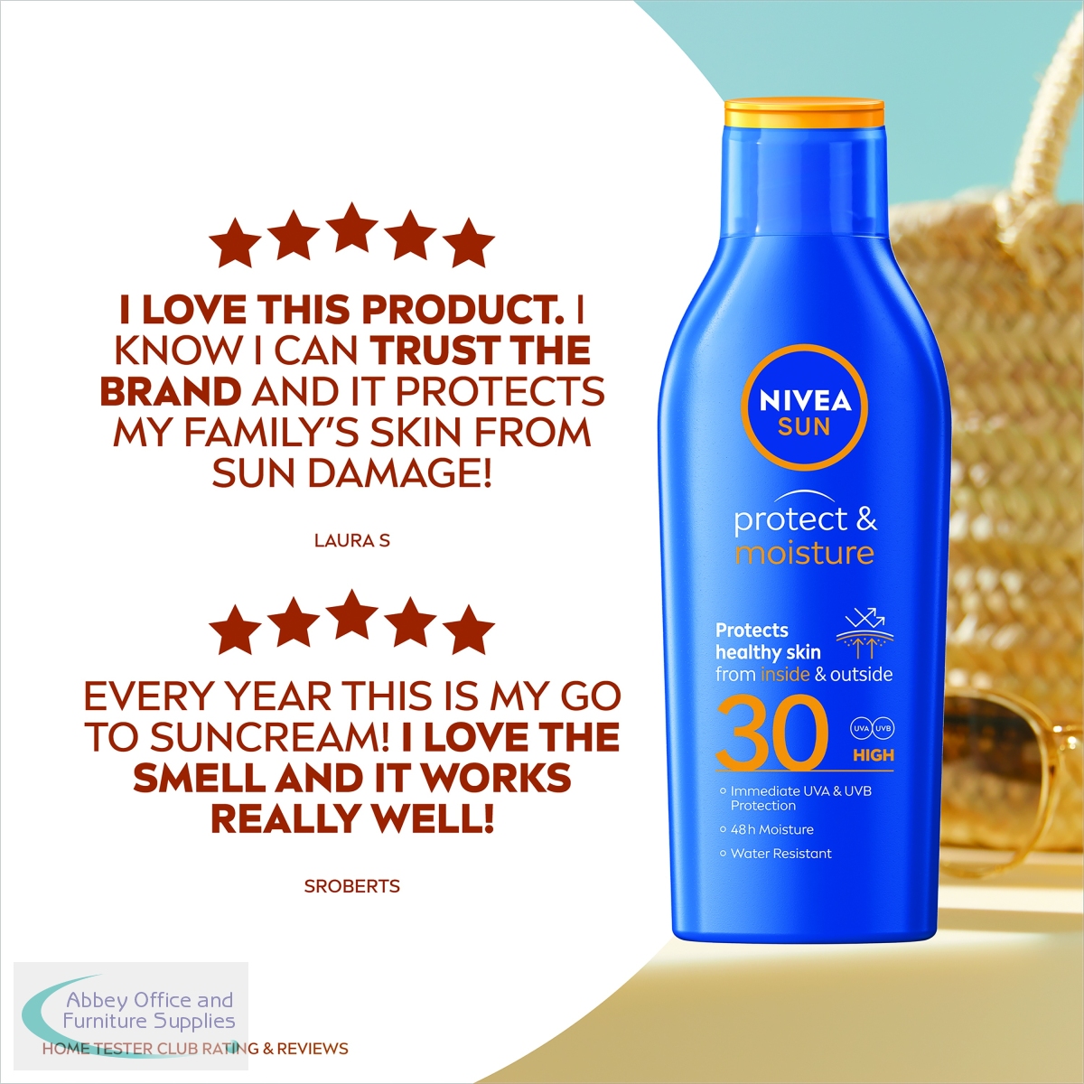 Nivea Sun Protect and Moisture Sun Cream Lotion protects healthy skin from inside and outside. It provides immediate UVA and UVB protection and supports skin protection with anti-oxidant Vitamin E to keep skin moisturised for 48 hour. The water-resistant formula is 82% biodegradable and respects the ocean as it is free from UV filters Octinoxate, Oxybenzone, Octocrylene and free of microplastic. Product packaging comes with 50% recycled bottle and cap (without label).