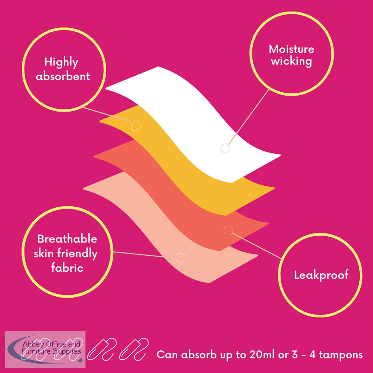 These fully washable, absorbent and very discreet pants are designed for periods and light bladder leaks. Featuring four layers of absorbent gusset fabric with a top layer of moisture wicking cotton; a second super absorbent layer; plus a third layer of breathable TPU which stops any moisture penetrating the outer layer. The outer layer is made from soft, breathable fabric. Suitable for use for up to 3 years, saving you money and helping the planet. Designed to be absorbent but discreet (no VPL). Supplied in black.