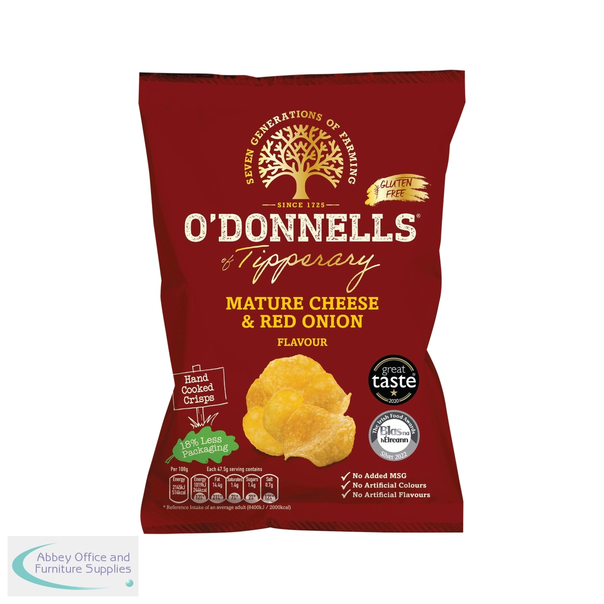 O'Donnells Mature Cheese and Red Onion flavour crisps boast the creamy flavour of mature cheese blended with the sweet, mellow hint of onion to create the rich taste of Ireland's hand cooked crisps. The flavour was inspired by the great taste of Mature Irish Cheddar from The Little Milk Company. Supplied in a pack of 32.