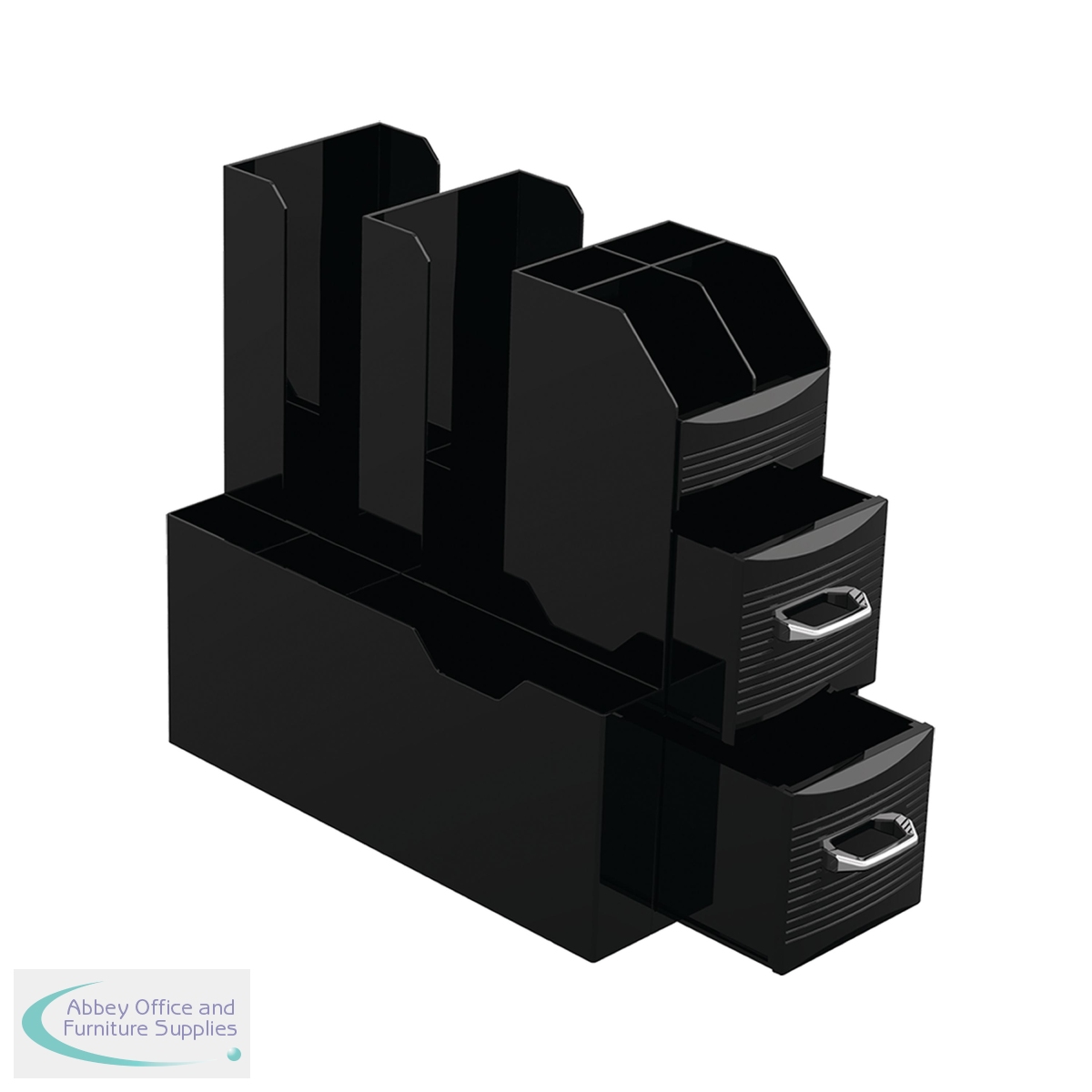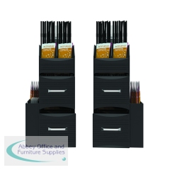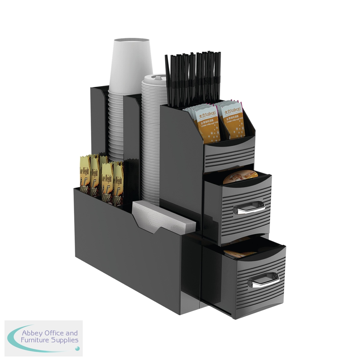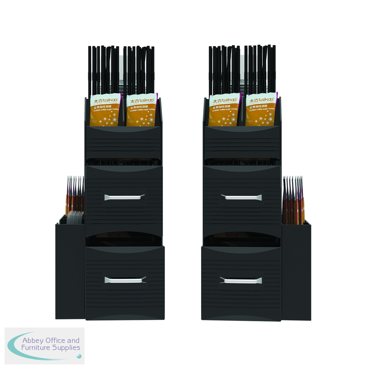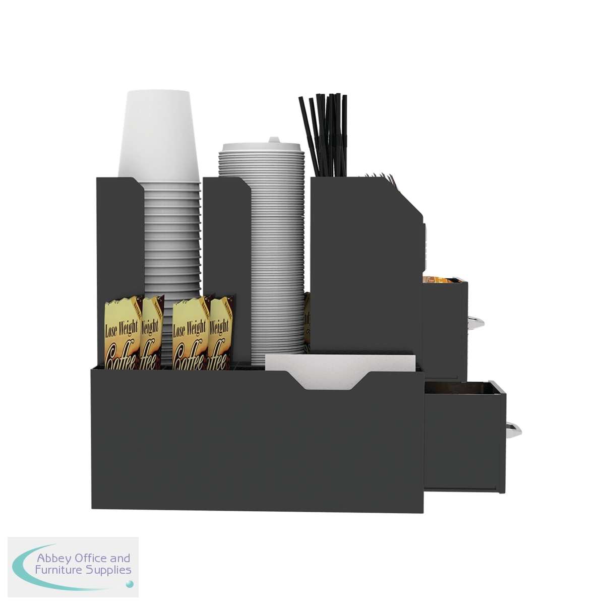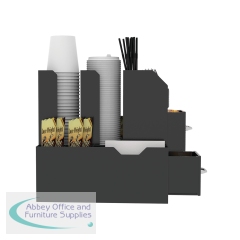 This 'All in one' design is a compact unit which holds coffee accessories. Featuring ten compartments, suitable for storing cup lids, spoons, stirrers, napkins, sugars and creamers. Supplied in black.