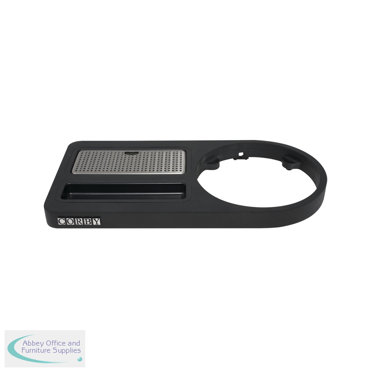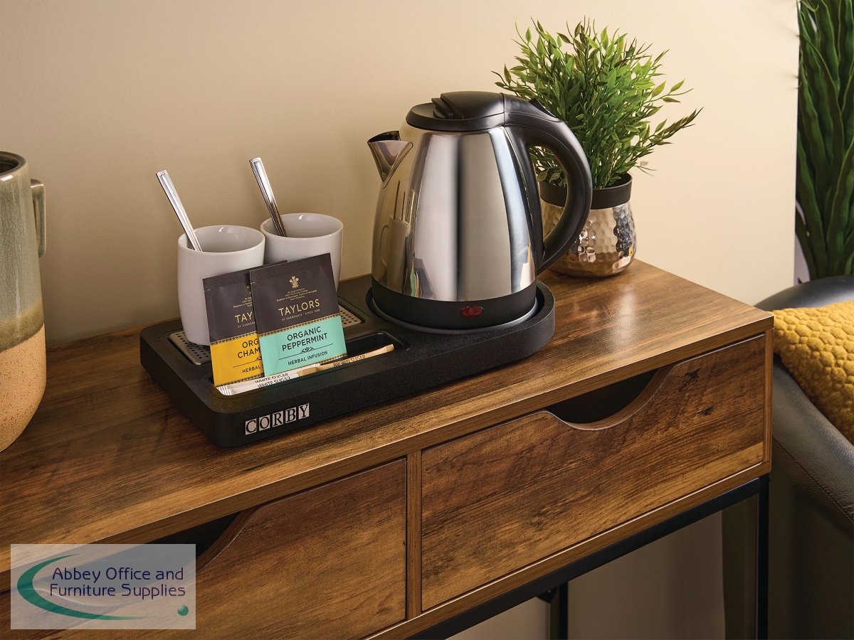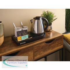 Enhance your guest room drinks experience with the Buckingham Compact Welcome Tray in black. Designed to perfectly accommodate our classic Corby Buckingham kettle, this sleek tray features a built-in sachet holder and an integrated drip tray for added convenience. Made from solid wood, the tray is eco-friendly, providing a sustainable option without compromising on style or durability. Easy to clean and designed with both functionality and sustainability in mind, this welcome tray is the perfect addition to any guest room.