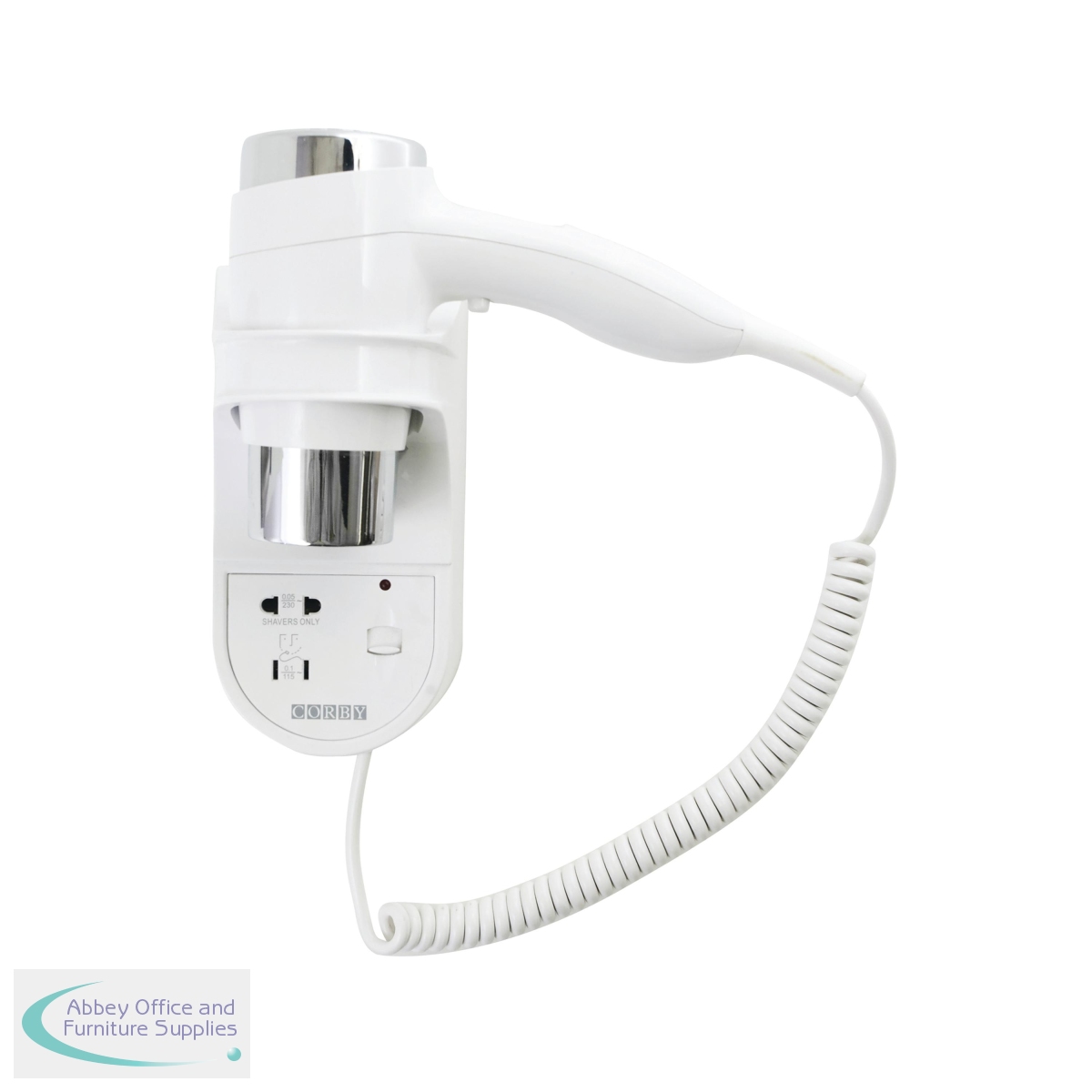 The Corby Kendal wall mounted hair dryer is specifically designed for the hotel bedroom. The hair dryer is supplied with a shaver socket and is a trigger activated for safety. Another feature is the 2 heat settings and cool blow option.