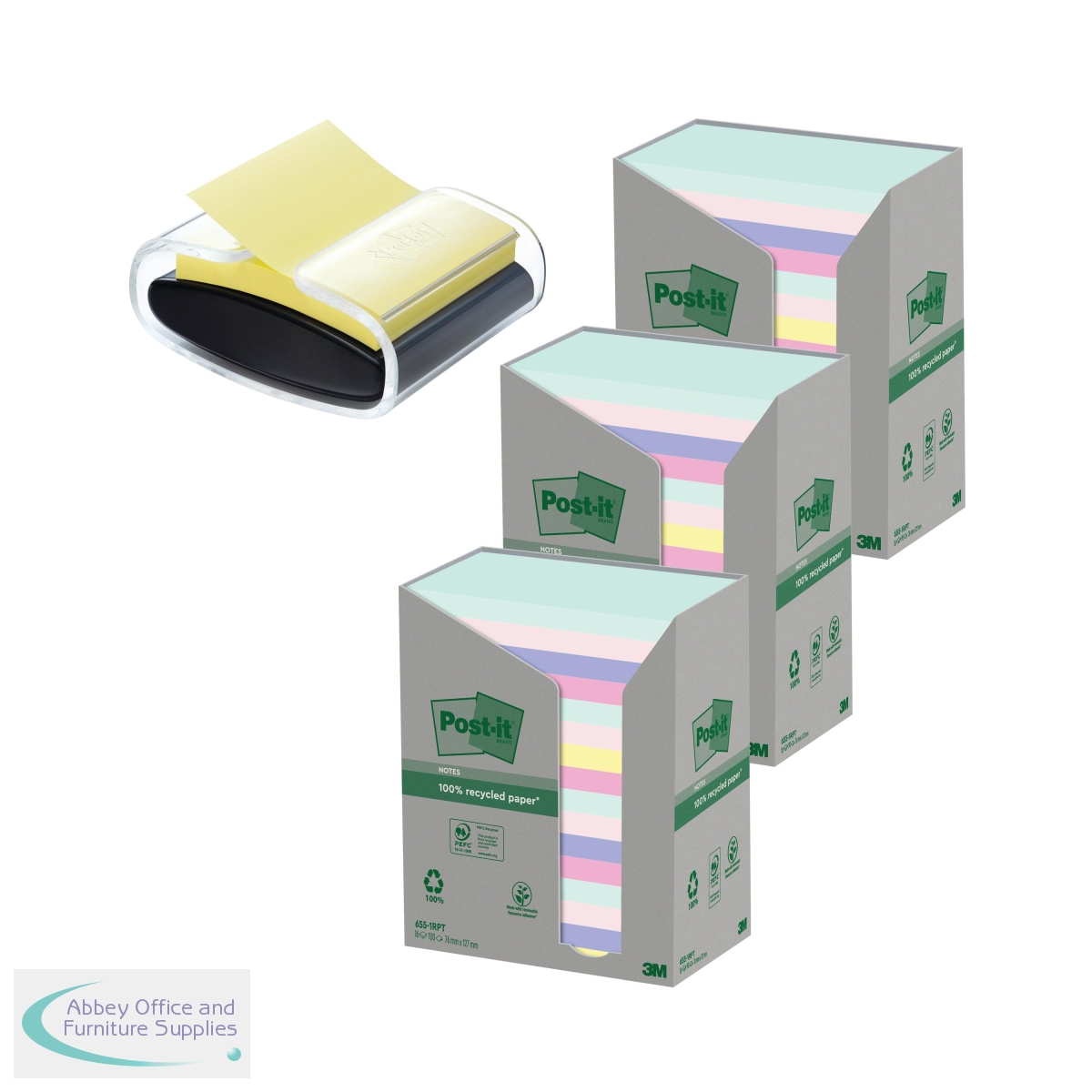 Ideal for desktop use, these environmentally friendly, repositionable Post-it Notes are made from 100% recycled paper with a strong adhesive that will adhere to most surfaces and remove cleanly. Perfect for making notes, or leaving messages and reminders, each pad contains 100 sheets and measures 76 x 127mm. Supplied in a recycled carton cabinet pack without individual film. This promotion pack contains 3 packs of 16 pads in assorted colours plus a FREE Post-It Pro Z-Note Dispenser in black.