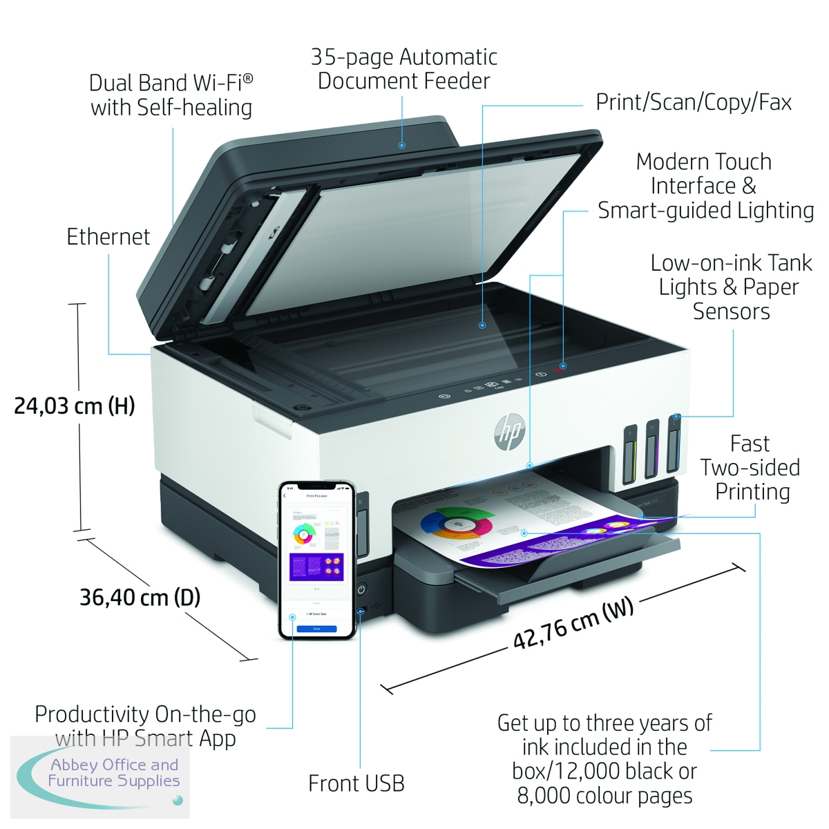 Take productivity up a level with a modern touch interface and premium experience on this cartridge-free printer. Plus, get outstanding print quality at a low cost, with up to three years of Original HP ink included in the box.