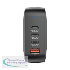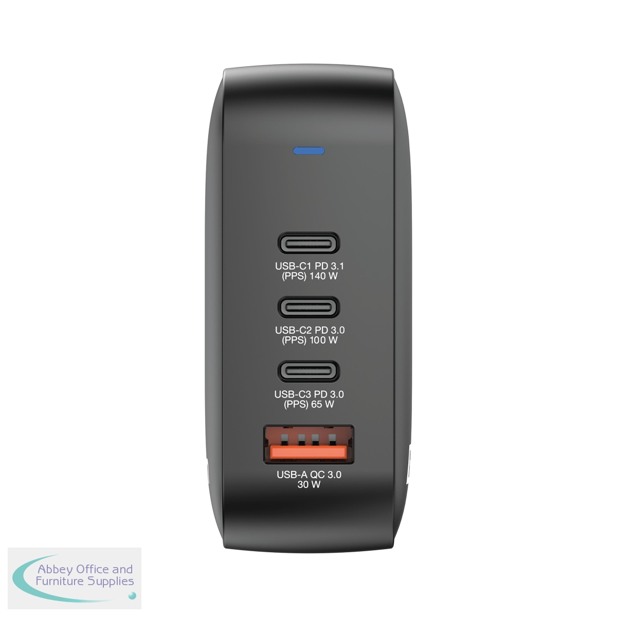 Combines three USB-C and one USB-A port into a compact, pocket-sized design. Capable of charging up to 4 devices simultaneously, the USB-C ports support PD 3.1 (Power Delivery) at 140W and PD 3.0 at 100W and 65W respectively while the USB-A port supports QC 3.0. Ideal for the office, home or travelling to power your laptop, tablet, smartphone, gaming devices, and more. With its foldable US prongs and replaceable EU and UK plugs, it's the ultimate travel companion.
