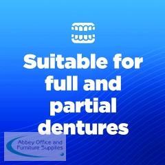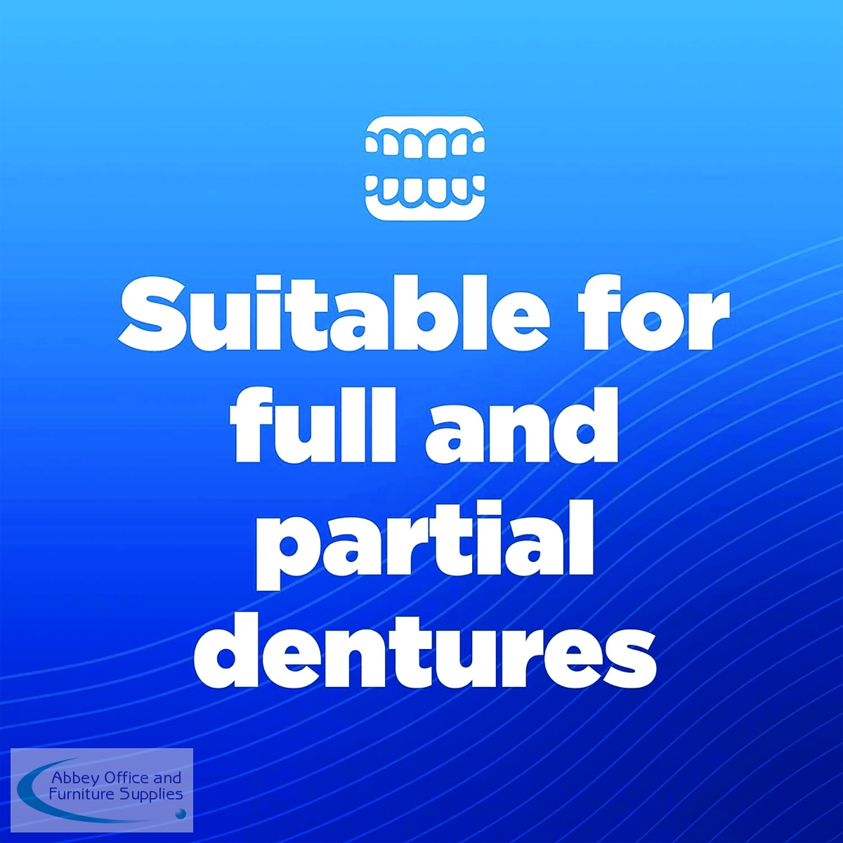 Steradent denture cleaner hygienically cleans dentures in just 3 minutes. The formula activates thousands of micro bubbles that carry the active oxygen all around the denture killing 99.9% of bacteria. Steradent daily denture cleaning provides a powerful in-depth clean, working where the toothbrush can't go and removing 50% more plaque than brushing alone. The formula is safe for metal parts and also suitable for both full and partial dentures. Always read the instructions before use.
