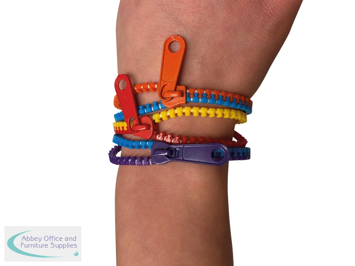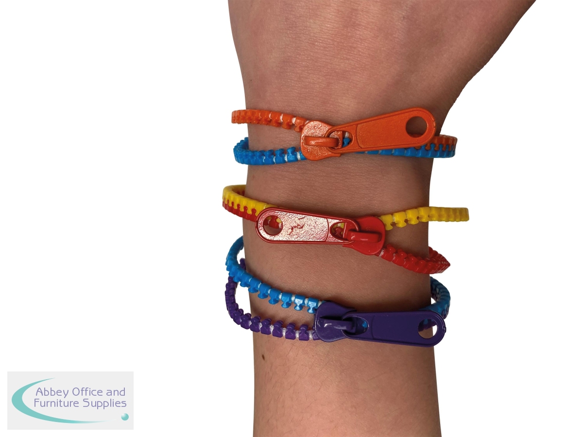 A brightly coloured sensory fidget zip that can be worn as a bracelet or looped around bags, clothes and keys so always on hand when the urge occurs to zip up and zip down. Perfect size for most childs' wrists and designed to help reduce stress, anxiety and help focus attention on other tasks. Ideal for children with ADHS, ADD, autism and anxiety.