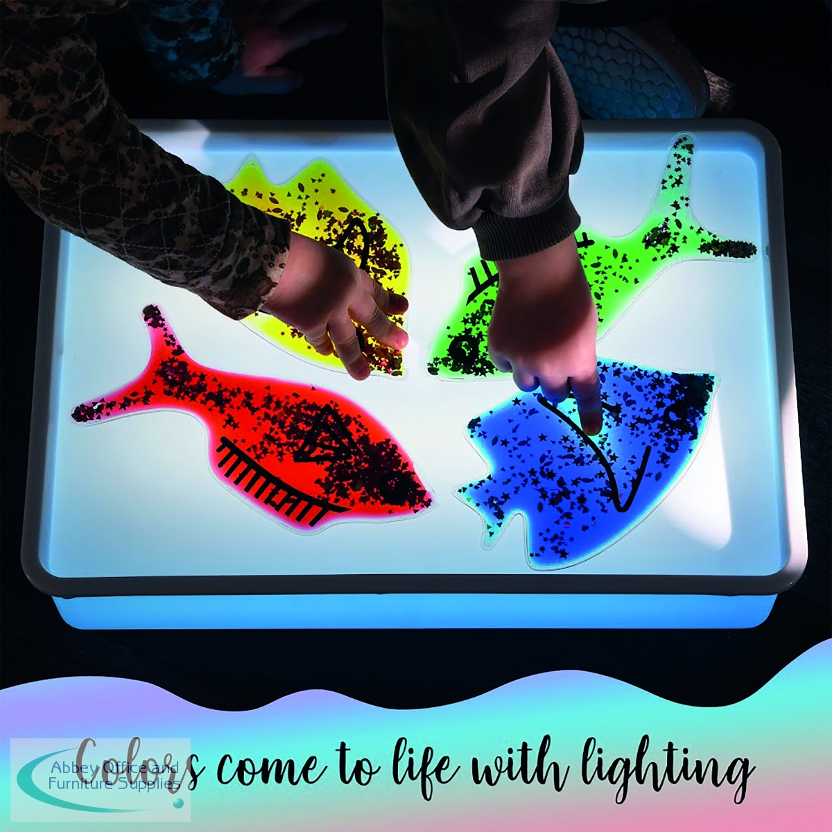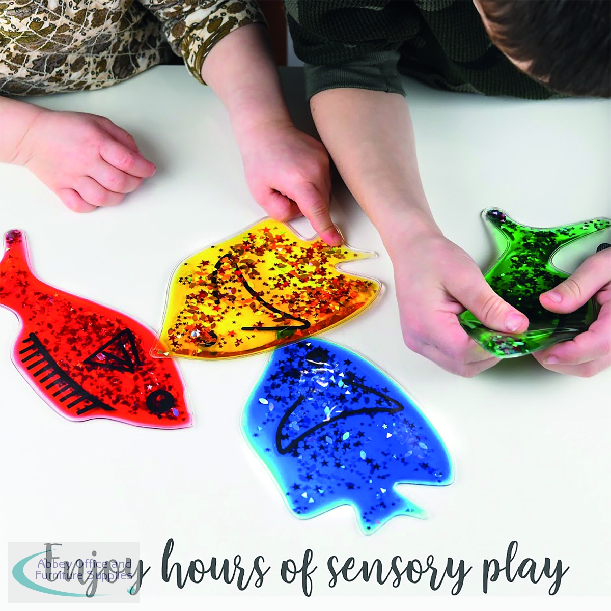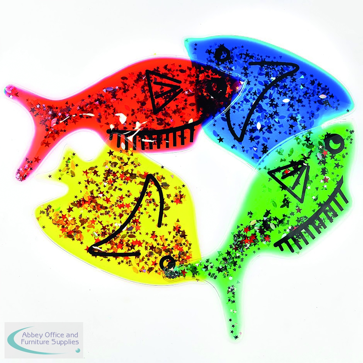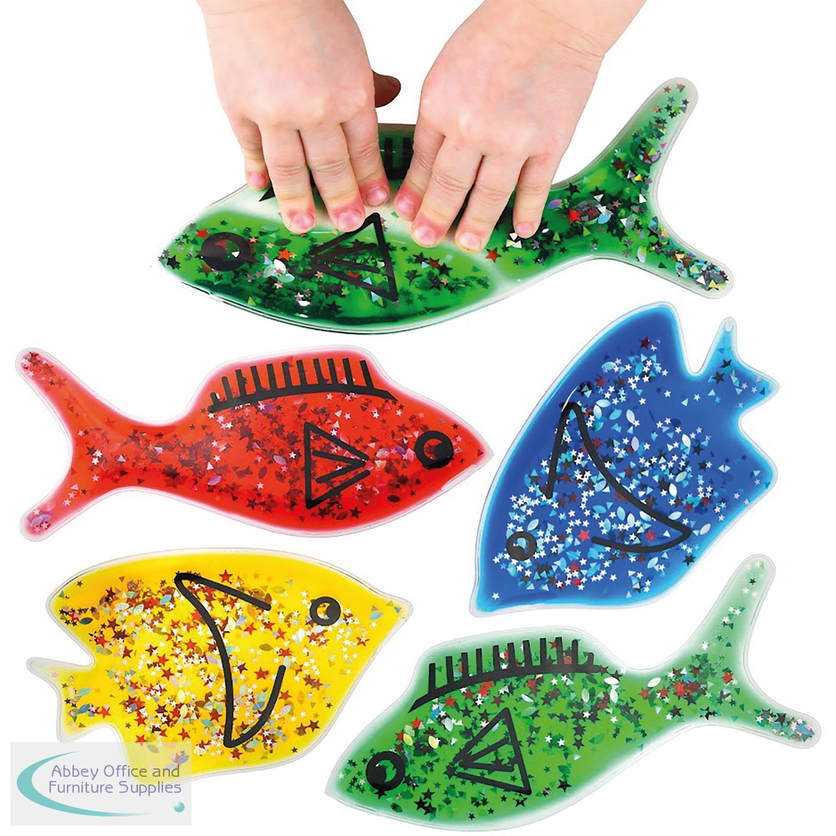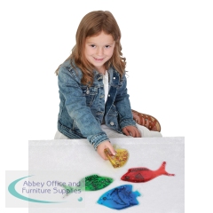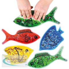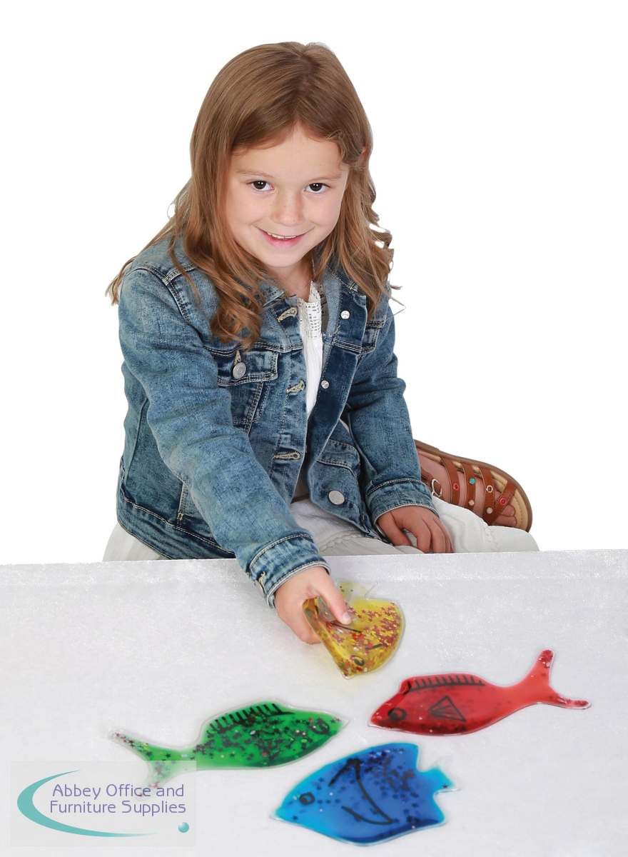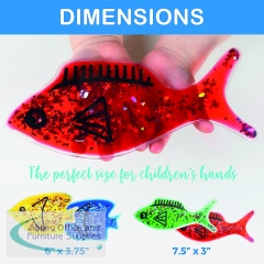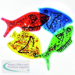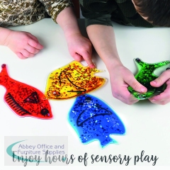 Nice colourful Jelly Fish with water, oil and glitter inside. Squeeze, bend or press these shapes in various colours. Great for any any classroom or sensory room. Help children learn shapes and colours. The length of each fish is 200mm with a weight of 180g.